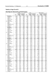 Deutscher Bundestag – 19. Wahlperiode – 63 – Drucksache 19/12486 Tabelle zu Frage 22 und 23 Abschläge bei Altersrenten im Rentenzugang Männer Frauen Männer und Frauen durchschnittl. durchschnittl. durchschnittl. durchschnittl. durchschnittl. durchschnittl. Anzahl Abschlags- Abschlagshöh Anzahl Abschlags- Abschlagshöh Anzahl Abschlags- Abschlagshöh monate e in Euro 2) monate e in Euro 2) monate e in Euro 2) Bundesgebiet 1) 134.175 30,83 114,93 185.760 43,23 103,86 319.935 38,03 113,02 Schleswig-Holstein 3.983 27,62 111,43 5.686 41,14 100,26 9.669 35,57 110,72 Hamburg 2.163 28,37 115,93 2.860 40,18 111,68 5.023 35,10 117,76 Niedersachsen 11.639 32,97 134,39 14.994 42,97 100,25 26.633 38,60 120,02 Bremen 888 30,55 120,47 1.179 40,54 95,66 2.067 36,25 110,67 Nordrhein-Westfalen 24.855 30,90 127,19 30.865 41,96 100,70 55.720 37,03 117,80 Hessen 9.723 30,48 124,50 12.271 41,74 104,54 21.994 36,77 118,32 Rheinland-Pfalz 6.469 33,32 136,62 7.809 44,56 103,78 14.278 39,47 124,26 2010 Baden-Württemberg 16.148 28,18 114,85 21.912 41,78 100,83 38.060 36,01 112,97 Bayern 20.593 30,63 119,63 26.972 42,23 100,71 47.565 37,21 113,78 Saarland 1.438 34,30 143,77 1.618 44,77 103,20 3.056 39,84 127,87 Berlin 3.959 32,40 115,21 6.499 41,93 117,46 10.458 38,32 118,51 Brandenburg 4.585 33,67 108,07 8.029 46,04 121,12 12.614 41,54 118,26 Mecklenburg-Vorpommern 2.969 32,88 101,40 5.350 44,88 116,37 8.319 40,59 112,55 Sachsen 9.136 32,66 100,67 16.139 45,66 113,44 25.275 40,96 110,87 Sachsen-Anhalt 4.927 32,97 101,49 9.195 47,59 119,51 14.122 42,49 115,39 Thüringen 4.811 31,55 96,60 8.537 45,76 113,62 13.348 40,64 109,65 Bundesgebiet 1) 141.861 28,52 107,40 194.995 41,87 102,01 336.856 36,25 109,15 Schleswig-Holstein 4.240 25,51 103,39 5.828 39,34 96,63 10.068 33,52 105,48 Hamburg 2.041 25,63 104,43 2.922 38,59 107,14 4.963 33,26 110,55 Niedersachsen 12.626 30,81 126,57 15.811 41,50 98,34 28.437 36,75 116,02 Bremen 893 28,54 114,11 1.248 39,80 98,49 2.141 35,10 109,65 Nordrhein-Westfalen 26.268 28,38 117,20 33.103 40,29 98,26 59.371 35,02 112,18 Hessen 10.466 28,34 116,79 12.395 39,90 101,90 22.861 34,61 113,74 Rheinland-Pfalz 6.702 30,52 125,18 8.331 42,88 100,98 15.033 37,37 117,77 2011 Baden-Württemberg 18.025 26,19 108,33 23.430 40,33 99,22 41.455 34,19 109,70 Bayern 20.912 28,61 112,87 27.669 41,18 99,10 48.581 35,77 110,34 Saarland 1.566 31,03 129,83 1.803 42,54 98,91 3.369 37,19 119,27 Berlin 4.125 29,10 104,34 6.489 40,34 114,15 10.614 35,97 112,60 Brandenburg 5.024 31,30 100,58 8.188 44,54 116,72 13.212 39,51 112,69 Mecklenburg-Vorpommern 3.092 30,20 92,66 5.661 44,51 114,96 8.753 39,45 108,87 Sachsen 9.727 29,77 92,60 17.713 44,44 113,18 27.440 39,24 108,03 Sachsen-Anhalt 5.235 30,36 93,23 9.606 46,35 117,06 14.841 40,71 110,93 Thüringen 5.273 28,99 88,06 9.025 44,68 111,88 14.298 38,89 105,29 Bundesgebiet 1) 129.087 23,18 89,04 126.951 30,94 78,53 256.038 27,03 86,59 Schleswig-Holstein 3.970 21,97 91,24 4.038 29,02 73,52 8.008 25,53 85,41 Hamburg 1.937 22,18 91,32 2.078 28,66 82,85 4.015 25,54 89,11 Niedersachsen 10.774 23,18 95,38 10.384 30,24 73,15 21.158 26,64 87,71 Bremen 882 22,45 89,62 813 29,23 75,08 1.695 25,70 85,25 Nordrhein-Westfalen 24.090 22,43 94,05 22.450 29,65 74,46 46.540 25,92 87,91 Hessen 9.066 23,35 99,15 8.385 29,79 78,00 17.451 26,44 91,81 Rheinland-Pfalz 6.113 23,85 97,84 5.632 30,81 75,16 11.745 27,19 90,12 2012 Baden-Württemberg 17.210 23,22 98,37 15.996 30,17 76,64 33.206 26,56 91,07 Bayern 18.408 23,21 93,89 17.493 30,45 76,24 35.901 26,74 88,33 Saarland 1.543 23,76 100,75 1.247 30,04 74,05 2.790 26,57 91,82 Berlin 3.487 23,26 84,79 4.158 29,44 85,70 7.645 26,62 86,50 Brandenburg 4.449 24,28 80,62 5.195 32,79 92,43 9.644 28,86 88,13 Mecklenburg-Vorpommern 2.906 23,66 76,41 3.500 32,41 90,39 6.406 28,44 85,09 Sachsen 9.151 23,91 76,58 10.531 33,32 91,36 19.682 28,94 85,66 Sachsen-Anhalt 4.891 24,22 77,34 5.581 35,19 97,66 10.472 30,07 89,44 Thüringen 4.870 23,74 76,06 5.353 33,10 90,08 10.223 28,64 84,63 Bundesgebiet 1) 130.343 22,61 87,14 107.676 24,70 64,34 238.019 23,55 77,50 Schleswig-Holstein 3.979 21,83 90,50 3.331 23,94 63,64 7.310 22,79 79,09 Hamburg 1.954 22,18 90,26 1.713 23,35 66,58 3.667 22,73 79,59 Niedersachsen 10.550 22,43 92,58 8.702 24,22 60,36 19.252 23,24 78,80 Bremen 882 22,71 88,21 795 23,96 62,34 1.677 23,30 76,37 Nordrhein-Westfalen 24.112 22,02 92,38 19.178 24,20 61,78 43.290 22,98 79,75 Hessen 8.813 23,13 98,29 7.115 24,84 66,67 15.928 23,89 84,86 Rheinland-Pfalz 6.103 22,88 95,62 4.592 24,97 61,45 10.695 23,78 81,90 2013 Baden-Württemberg 16.640 23,20 99,56 13.490 24,49 63,72 30.130 23,78 84,10 Bayern 17.896 22,88 93,69 14.815 24,87 63,73 32.711 23,78 80,93 Saarland 1.505 22,65 96,06 1.068 24,97 62,67 2.573 23,61 83,23 Berlin 3.552 22,57 81,26 3.903 23,31 69,26 7.455 22,96 75,11 Brandenburg 5.212 22,95 76,72 4.950 25,04 74,74 10.162 23,97 75,97 Mecklenburg-Vorpommern 3.320 22,16 71,66 3.082 25,05 73,51 6.402 23,55 72,78 Sachsen 9.967 22,54 73,29 8.780 25,36 70,74 18.747 23,86 72,45 Sachsen-Anhalt 5.550 22,41 71,52 4.540 25,41 68,88 10.090 23,76 70,72 Thüringen 5.331 22,14 71,54 4.540 25,45 70,73 9.871 23,66 71,56 Bundesgebiet 1) 106.818 23,45 87,36 89.827 23,49 61,87 196.645 23,47 75,73 Schleswig-Holstein 2.963 22,50 88,92 2.595 23,01 60,38 5.558 22,74 75,78 Hamburg 1.590 22,79 87,64 1.458 22,31 63,87 3.048 22,56 76,14 Niedersachsen 9.180 24,85 102,23 7.273 23,25 59,19 16.453 24,15 82,56 Bremen 714 23,17 86,50 665 22,12 56,22 1.379 22,66 71,55 Nordrhein-Westfalen 19.281 23,27 93,01 16.957 23,04 58,58 36.238 23,16 76,80 Hessen 7.182 24,11 100,66 5.776 23,98 65,48 12.958 24,05 84,92 Rheinland-Pfalz 5.022 24,82 101,78 3.965 23,69 59,56 8.987 24,32 82,67 2014 Baden-Württemberg 12.587 23,91 98,78 10.515 23,64 61,81 23.102 23,78 81,82 Bayern 14.248 24,23 97,72 11.974 24,12 61,52 26.222 24,18 81,15 Saarland 1.318 24,19 98,81 923 22,91 55,91 2.241 23,66 80,58 Berlin 3.731 22,03 73,84 3.396 21,92 64,09 7.127 21,98 69,19 Brandenburg 4.515 2
