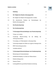 -3- Inhaltsverzeichnis Seite 1. Einleitung 4 2. Die Tätigkeit des Bundesverfassungsgerichts 5 2.1. Die Tätigkeit des Bundesverfassungsgerichts in Zahlen 5 2.2. Die demokratische Funktion der Entscheidungen des Bundesverfassungsgerichts 5 3. Das Demokratieprinzip 6 4. Das Sozialstaatsprinzip 6 5. Verfassungsgerichtsentscheidungen zum Demokratieprinzip 7 5.1. Vertrag von Lissabon 7 5.2. Unzulässige Mischverwaltung bei der Bildung der Arbeitsgemeinschaften 9 5.3. Verwendung von Wahlcomputern verfassungswidrig 10 5.4. Verfassungswidrigkeit des Effekts des negativen Stimmgewichts 12 5.5. BND-Untersuchungsausschuss 14 5.6. Ausländerwahlrecht 16 6. Verfassungsgerichtsentscheidungen zum Sozialstaatsprinzip 18 6.1. Besteuerung des Existenzminimums 18 6.2. Nichtberücksichtigung von Zeiten des Mutterschutzes 19 6.3. Kindererziehungszeiten 20 6.4. Numerus Clausus 21 6.5. Leistungspflicht der gesetzlichen Krankenversicherung 23