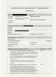 Kontrolibereich Detailfeststellungen (ggf. Beiblatt/Anlagen): Verstoß Siehe Bild Nr. 18, 19, 23 und 24 Fundstelle (Gesetz): Art. 4 Abs. 2 i.V.m. Anh. II Kap. II Nr. 1f (Verordnung (EG) Nr. 852/2004 über Lebensmittelhygiene) im Behebung: Theke 10. sachfremde Kontrollpunkte/Verstöße, Leer 1 - sachfremde Verstöße x Für das gesamte Küchenpersonal ohne eine wissenschaftliche Ausbildung oder eine Berufsausbildung fehlte eine Schulung, in der Kenntnisse und Fertigkeiten auf dem Gebiet des Verkehrs mit Lebensmitteln einschließlich der Lebensmittelhygiene vermittelt werden. Fundstelle (Gesetz): () Behebung: Gesamt-Ergebnis: Beanstandungen U] Keine [] Geringgradige [J] Mittelgradige Maßnahmen: Datum: Art der Maßnahme: Status: [L_] Hochgradige