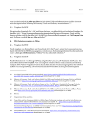 Wissenschaftliche Dienste Dokumentation Seite 9 WD 8 - 3000 - 085/20 Brennstoffwirkungsgraden differenziert nach fünf verschiedenen Fahrzeugtypen mit der Angabe 30 in Liter/100km. 5. Übersicht Die folgende Übersicht stellt nationale PKW-Standards hinsichtlich des Brennstoffwirkungsgra- des (km/l) gegenüber. Die EU verfügt über die strengsten Standards vor denen der Weltmärkte USA (SAFE-Standard) und China. Japan rangiert hinter der EU und vor den USA und China. Mögliche Entwicklungen unter der bevorstehenden Biden-Administration, die die US-Standards etwa auf das Niveau Japans anheben könnten, sind noch nicht berücksichtigt. Quelle: icct (2019). Japan 2030 fuel economy standards. S. 7. https://theicct.org/sites/default/fi- les/publications/Japan_2030_fuel_standard_update_20191007.pdf (letzter Zugriff: 27.11.2020). 30 Ebenda.