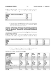 Drucksache 19/20833 –2– Deutscher Bundestag – 19. Wahlperiode Die folgende Tabelle gibt die Anzahl der durch die Zollverwaltung eingeleite- ten Ermittlungsfälle an. Nach Drogenarten wird in der Statistik nicht differen- ziert. Anzahl der eingeleiteten Ermittlungsfälle 2020 Januar 1859 Februar 1871 März 1398 April 982 Mai 1452 2. Wie viele Fälle von Rauschgiftkriminalität wurden jeweils in den Monaten Januar bis Mai der Jahre 2017, 2018 und 2019 in Deutschland registriert (bitte nach Suchtstoff und Verstoß auflisten)? Hinsichtlich der polizeilichen Daten wird auf die Polizeiliche Kriminalstatistik für die Jahre 2017, 2018 und 2019 verwiesen, in der die jeweiligen Daten in der Tabelle 08 „Tatzeitstatistik“ abgebildet sind. Die Polizeiliche Kriminalstatistik ist abrufbar unter: www.bka.de/DE/AktuelleInformationen/StatistikenLagebilder/PolizeilicheKri minalstatistik/pks_node.html. Die folgende Tabelle gibt die Anzahl der durch die Zollverwaltung eingeleite- ten Ermittlungsfälle an. Nach Drogenarten wird in der Statistik nicht differen- ziert. Anzahl der eingeleiteten Ermittlungsfälle 2019 2018 2017 Januar 2267 1541 1360 Februar 2323 1506 1240 März 2315 1744 1505 April 1998 1438 1328 Mai 1925 3032 1517 3. Welcher Umfang welcher illegalen Substanz wurde jeweils in den Mona- ten Januar bis Mai 2020 durch Zoll und Polizei sichergestellt? Durch den Zoll erfolgten folgende Sicherstellungen: Sicherstellungen 2020 Januar Februar März April Mai Heroin (kg) 4,344 26,069 245,828 4,263 8,466 Opium (kg) 1,000 0,054 0 0 0,015 Kokain (kg) 791,570 61,722 2026,428 24,935 618,201 Amfetamin (kg) 54,427 41,154 118,957 27,309 254,739 Ecstasy (Stück) 48750 171291 123742 89289 27946 LSD (Trips) 800 2911 1787 571 22402 Crystal (kg) 9,959 21,681 3,788 1,311 1,089 Haschisch (kg) 177,883 45,437 1487,080 9,021 423,486 Marihuana (kg) 294,237 263,850 195,531 212,624 405,071 Khat (kg) 33,057 507,920 111,740 60,950 0,000 Cannabispflanzen (Stück) 99 411 73 202 14 Meskalin (kg) 0 0 0 4,939 0 Subutex (Stück) 9 700 112 267 1400 NPS (g) 3,135 10,535 0,269 781,573 0,466