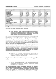 Deutscher Bundestag – 19. Wahlperiode –5– Drucksache 19/20833 satz 2 Satz 1 Nummer 2 bis 6 BtMVV spätestens sechs Monate nach Bekannt- werden der Beendigung des Verschreibens aus dem Datenbestand des Substitu- tionsregisters zu löschen sind. Daten aus dem Jahr 2019 stehen aus diesem Grund nicht mehr zur Verfügung. In den Monaten Januar bis Mai 2020 waren zum jeweiligen 1. des Monats nachfolgende Patientenzahlen gemeldet: 01.01.2020: 78900 01.02.2020: 79372 01.03.2020: 79377 01.04.2020: 79761 01.05.2020: 80339 Bei der Bewertung der Daten ist zu beachten, dass sich durch Aufklärung ein- zelner Meldesachverhalte im Nachhinein noch Aktualisierungen ergeben kön- nen. Das betrifft insbesondere die Zahlen aus den letzten beiden genannten Mo- naten. 8. Wie viele Take-Home-Verschreibungen wurden in den Monaten Januar bis Mai 2020 im Vergleich zu den jeweiligen Monaten des Vorjahres 2019 in Deutschland nach Kenntnis der Bundesregierung ausgestellt? Der Bundesregierung liegen Daten bis April 2020 vor. Im ersten Quartal 2019 wurden ca. 110.000 Fertigarzneimittelpackungen und Rezepturen an Substitu- tionsmitteln zu Lasten der gesetzlichen Krankenversicherungen (GKV) von der Apotheke abgegeben. Im ersten Quartal 2020 wurden ca. 128.000 Fertigarznei- mittelpackungen und Rezepturen abgegeben. Der Bundesregierung liegen keine differenzierten Daten über Take-Home-Verordnungen vor. 9. Wie viele opioidabhängige Insassen wurden aufgrund der Covid-19-Pan- demie nach Kenntnis der Bundesregierung frühzeitig aus dem Gefängnis entlassen, und wie wurde eine Anschlusssubstitution sichergestellt? Die Bundesregierung verfügt über keine Statistik, die frühzeitige Entlassungen von opioidabhängigen Insassen aufgrund der Covid-19-Pandemie ausweist. Die Durchführung des Justizvollzuges und die Gesetzgebung sind nach der ver- fassungsmäßigen Ordnung der Bundesrepublik Deutschland ausschließlich eine Angelegenheit der Länder (Artikel 30, 70 Absatz 1 des Grundgesetzes). Die ge- sundheitliche Versorgung von Inhaftierten obliegt daher ebenfalls den Ländern. 10. Wie viele Substitutionspatienten wurden in den Monaten Januar bis Mai 2020 im Vergleich zu den jeweiligen Monaten des Vorjahres 2019 nach Kenntnis der Bundesregierung pro Arztpraxis gemeldet? Eine monatsbezogene Darstellung von Patientenzahlen je Arztpraxis ist tech- nisch ausgeschlossen. Darüber hinaus stehen Daten aus dem Jahr 2019 aus den in der Antwort zu Frage 7 aufgeführten Gründen nicht mehr zur Verfügung.