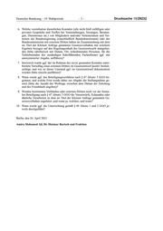 Deutscher Bundestag – 19. Wahlperiode –3– Drucksache 19/29232 6. Welche vereinbarten dienstlichen Kontakte (alle nicht bloß zufälligen oder privaten Gespräche und Treffen bei Veranstaltungen, Sitzungen, Beratun- gen, Dienstreisen etc.) von Mitgliedern und/oder Vertreterinnen und Ver- tretern der Bundesregierung (einschließlich Bundeskanzleramt) oder der Bundesministerien mit externen Dritten haben im Zusammenhang mit dem im Titel der Kleinen Anfrage genannten Gesetzesvorhaben mit welchem Ergebnis bezogen auf den Regelungsinhalt des Gesetzentwurfs stattgefun- den (bitte tabellarisch mit Datum, Ort, teilnehmenden Personen, für die Teilnehmenden des zuständigen federführenden Fachreferates ggf. mit anonymisierter Angabe, aufführen)? 7. Inwieweit wurde ggf. der im Rahmen des zuvor genannten Kontakts unter- breitete Vorschlag eines externen Dritten im Gesetzentwurf positiv berück- sichtigt, und wie ist dieser Umstand ggf. im Gesetzentwurf dokumentiert worden (bitte einzeln ausführen)? 8. Wann wurde ggf. das Beteiligungsverfahren nach § 47 Absatz 3 GGO be- gonnen, und welche Frist wurde dabei zur Abgabe der Stellungnahme ge- setzt (bitte die Anzahl der Werktage zwischen dem Datum der Zuleitung und des Fristablaufs angeben)? 9. Wurden bestimmten Verbänden oder externen Dritten noch vor der forma- len Beteiligung nach § 47 Absatz 3 GGO die Vorentwürfe, Eckpunkte oder ähnliche Vorarbeiten zu dem im Titel der Kleinen Anfrage genannten Ge- setzesvorhaben zugeleitet ,und wenn ja, welchen, und wann? 10. Wann wurde ggf. die Unterrichtung gemäß § 48 Absatz 1 und 2 GGO je- weils durchgeführt? Berlin, den 26. April 2021 Amira Mohamed Ali, Dr. Dietmar Bartsch und Fraktion