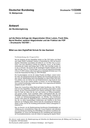 Deutscher Bundestag Drucksache 19/22406 19. Wahlperiode 15.09.2020 Antwort der Bundesregierung auf die Kleine Anfrage der Abgeordneten Oliver Luksic, Frank Sitta, Bernd Reuther, weiterer Abgeordneter und der Fraktion der FDP – Drucksache 19/21991 – Mittel aus dem DigitalPakt Schule für das Saarland Vorbemerkung der Fragesteller Mit der Einigung auf den DigitalPakt Schule im Mai 2019 haben sich Bund und Länder darauf verständigt, Schulen in Deutschland bis 2024 mit besserer digitaler Infrastruktur auszustatten und dafür bis zu 5,55 Mrd. Euro zu inves- tieren. Laut einer aktuelleren Umfrage des Magazins „Focus“ an alle Kultus- ministerien der Länder sind bislang rund 125 Mio. Euro bewilligt worden: al- so nur 2,5 Prozent. Die Kosten für die beantragten Projekte belaufen sich auf rund 284 Mio. Euro (5,7 Prozent) https://www.focus.de/magazin/kurzfassunge n/focus-25-2020-schulen-rufen-kaum-geld-aus-digitalpakt-ab-bisher-nur-2-5-p rozent-der-finanzmittel-bewilligt_id_12091309.html). Die Geschwindigkeit, mit der die Länder Projekte bewilligen, variiert weiter- hin stark. Das Bundesministerium für Bildung und Forschung geht davon aus, dass sich die Mittelbindung durch Bewilligungen im Jahresverlauf 2020 deut- lich erhöhen wird. Im Februar hat sich Bundesministerin Anja Karliczek dazu geäußert, sich mit den Ländern darüber zu beraten, wie der Bewilligungspro- zess eventuell beschleunigt werden kann (https://www.tagesschau.de/inland/di gitalpakt-ein-jahr-101.html). Wegen der Corona-Krise haben Bund und Länder beschlossen, dass 100 Mio. Euro aus dem DigitalPakt vorübergehend und kurzfristig umgewidmet werden können, um den Unterrichtsausfall an den Schulen aufzufangen. Diese Summe kann bis Ende des Jahres für den Auf- und Ausbau von Online-Lernplattfor- men genutzt werden. Auch Lerninhalte sollten vorübergehend über die vom Digitalpakt finanzierte Infrastruktur finanziert werden können. Zusätzlich da- zu wurde ein Sofortausstattungsprogramm von 500 Mio. Euro beschlossen. Schulen sollen damit die Möglichkeit haben, technische Endgeräte anzuschaf- fen, die vor allem benachteiligten Schülerinnen und Schülern in der Krise leihweise zur Verfügung stehen. Ebenso kann die Ausstattung der Schulen ge- fördert werden, die für die Erstellung professioneller Online-Lehrangebote er- forderlich ist. Das vor Kurzem von der Bundesregierung beschlossene Konjunkturpaket zur Abfederung der wirtschaftlichen Folgen der Corona-Pandemie sieht außerdem eine Erweiterung des Katalogs der förderfähigen Investitionen im Rahmen des DigitalPakts vor. Sowie eine Beteiligung bei der Ausbildung und Finanzierung der Systemadministratoren, wenn die Länder im Gegenzug die digitale Weiter- Die Antwort wurde namens der Bundesregierung mit Schreiben des Bundesministeriums für Bildung und Forschung vom 14. September 2020 übermittelt. Die Drucksache enthält zusätzlich – in kleinerer Schrifttype – den Fragetext.