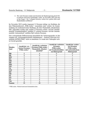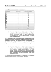 Deutscher Bundestag – 19. Wahlperiode –3– Drucksache 19/17020 Verteilung der PMK-rechts- mit Zuordnung zum Themenfeld „Hasskriminali- tät“: Bundesland Gewalttaten Sonstige Straftaten BB 1 12 BE 11 49 BW 2 33 BY 5 27 HB 1 2 HE 0 2 HH 0 1 MV 2 16 NI 3 30 NW 2 22 RP 4 18 SH 0 4 SL 0 2 SN 3 18 ST 0 9 TH 0 0 Summe 34 245 a) Welche der in Frage 3 aufgeführten Fälle wird der Teilmenge „frem- denfeindliche Straftaten“ und welche der Teilmenge „antisemitische Straftaten“ zugerechnet (bitte bezogen auf die Bundesländer auffüh- ren)? b) Wie verteilen sich die in den Fragen 3 und 3a aufgeführten Fälle nach Gewalttaten bezogen auf die Bundesländer? Die Fragen 3a und 3b werden aufgrund des Sachzusammenhangs gemeinsam beantwortet. Bei 272 Straftaten im Bereich PMK-rechts-, darunter 32 Gewalttaten und 29 Propagandadelikte, konnte ein fremdenfeindlicher Hintergrund festgestellt wer- den. Verteilung der PMK-rechts- mit fremdenfeindlichem Hintergrund: Bundesland Gewalttaten Sonstige Straftaten BB 1 12 BE 11 49 BW 2 32 BY 4 27 HB 1 2 HE 0 2 HH 0 1 MV 2 16 NI 3 30 NW 1 21 RP 4 17 SH 0 4 SL 0 2 SN 3 16 ST 0 9 TH 0 0 Summe 32 240
