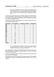 Drucksache 19/17020 –6– Deutscher Bundestag – 19. Wahlperiode 5. Wie viele Tatverdächtige wurden nach Kenntnis der Bundesregierung im Zusammenhang mit den in der Frage 1 erfragten Fällen ermittelt, und ge- gen wie viele davon wurde ein Haftbefehl erlassen (bitte nach Bundeslän- dern, konkretem Tatvorwurf und Geschlecht der Beschuldigten aufschlüs- seln)? Zu den für den Monat November 2019 bislang erfassten 913 politisch rechts- motivierten Straftaten wurden insgesamt 387 Tatverdächtige, davon 357 männ- lich, ermittelt. Vier männliche Tatverdächtige wurden vorläufig festgenommen. Es wurde kein Haftbefehl erlassen. Verteilung der ermittelten Tatverdächtigen und vorläufig festgenommenen Per- sonen im Bereich „PMK-rechts-“: Bundesland Tatverdächtige vorläufige Festnahmen Haftbefehle BB 51 0 0 BE 32 0 0 BW 35 0 0 BY 40 4 0 HB 3 0 0 HE 1 0 0 HH 1 0 0 MV 47 0 0 NI 50 0 0 NW 25 0 0 RP 22 0 0 SH 6 0 0 SL 3 0 0 SN 43 0 0 ST 28 0 0 TH 0 0 0 Summe 387 4 0 6. Wie viele Nachmeldungen bezüglich der PMK-rechts sind nach Kenntnis der Bundesregierung im Jahr 2019 von den Ländern bisher insgesamt übermittelt worden (bitte nach Ländern aufschlüsseln)? Eine automatisierte Erhebung der Nachmeldungen für das Jahr 2019 aus der BKA-Fallzahlendatei „Lagebild Auswertung politisch motivierte Straftaten“ (LAPOS) ist nicht möglich. Vor diesem Hintergrund werden die aktuellen Fallzahlen für die Monate Januar bis November 2019 aufgeführt. In den Monaten Januar bis November 2019 wurden insgesamt 18.025 Straftaten mit politisch rechtsmotiviertem Hintergrund gemeldet. Darunter waren 791 Ge- walttaten.