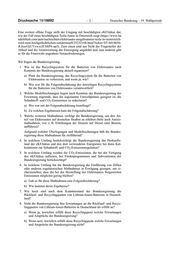 Drucksache 19/18892 –4– Deutscher Bundestag – 19. Wahlperiode 17. Erfüllt der aktuelle Stand des Recyclingsystems der Batterien von Elektro- autos vor dem Hintergrund des Aktionsplans zur Kreislaufwirtschaft der EU die Erwartungen der Bundesregierung? a) Wenn ja, inwiefern werden welche Erwartungen und Ansprüche der Bundesregierung erfüllt? b) Wenn nein, inwiefern werden welche Erwartungen und Ansprüche der Bundesregierung nicht erfüllt? 18. Welche praktischen Erfahrungen sind der Bundesregierung zum Recycling von im Umlauf befindlichen eKFAkkus bekannt? Wie unterscheiden sich die Erfahrungen bei beschädigten und nichtbeschä- digten eKFAkkus? 19. Entsprechen die mit dem Recycling von beschädigten und unbeschädigten eKFAkkus gemachten Erfahrungen vor dem Hintergrund des Aktionsplans zur Kreislaufwirtschaft der EU den Anforderungen der Bundesregierung? a) Wenn ja, inwiefern werden welche Anforderungen erfüllt? b) Wenn nein, inwiefern werden welche Anforderungen nicht erfüllt? 20. Sind der Bundesregierung Fälle bekannt, in denen eKFAkkus nicht ord- nungsgemäß entsorgt wurden? Wenn ja, wie viele? 21. Wo gibt es nach Kenntnis der Bundesregierung in Deutschland Recycling- anlagen, die ausgediente Lithium-Ionen-Akkus aufbereiten können? 22. Wie viele eKFAkkus können die genannten Recyclinganlagen nach Kennt- nis der Bundesregierung pro Tag bzw. Woche bzw. Monat aufbereiten? 23. Gibt es zum aktuellen Zeitpunkt eine Sammel- und/oder Recyclingquote für eKFAkkus? a) Wenn ja, wie hoch ist die Recyclingquote, und wie soll sie realisiert werden? b) Wenn nein, warum nicht? 24. Plant die Bundesregierung ein Label für ein recyclingfähiges Produktde- sign, wie es Acatech vorgeschlagen hat (https://www.acatech.de/publikatio n/rohstoffe-fuer-die-energiewende-wege-zu-einer-sicheren-und-nachhaltig en-versorgung/, S. 81)? a) Wenn ja, was ist der aktuelle Stand der Planung? b) Wenn nein, warum nicht? 25. Welche Möglichkeiten des Recyclings von ausrangierten Autobatterien sind der Bundesregierung bekannt? a) Wo befinden sich nach Kenntnis der Bundesregierung Recyclinganla- gen für ausrangierte Autobatterien? b) Welche Recyclingmethoden werden an den genannten Stationen an- gewendet? c) Inwieweit fördert die Bundesregierung aktuell Forschungsprojekte zum Recycling von ausrangierten Autobatterien? d) In welchem Umfang gibt es Subventionen für das Recycling von aus- rangierten Autobatterien?