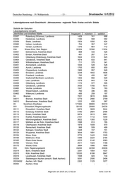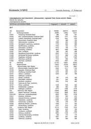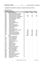 Deutscher Bundestag – 19. Wahlperiode – 19 – Drucksache 19/12512 Lebendgeborene nach Geschlecht - Jahressumme - regionale Tiefe: Kreise und krfr. Städte Statistik der Geburten Lebendgeborene (Anzahl) Jahr/Kreise und kreisfreie Städte Insgesamt männlich weiblich 09771 Aichach-Friedberg, Landkreis 1392 704 688 09772 Augsburg, Landkreis 2459 1243 1216 09773 Dillingen a.d.Donau, Landkreis 841 424 417 09774 Günzburg, Landkreis 1176 611 565 09775 Neu-Ulm, Landkreis 1685 902 783 09776 Lindau (Bodensee), Landkreis 754 386 368 09777 Ostallgäu, Landkreis 1397 702 695 09778 Unterallgäu, Landkreis 1292 670 622 09779 Donau-Ries, Landkreis 1261 659 602 09780 Oberallgäu, Landkreis 1454 785 669 10 Saarland 8313 4266 4047 10041 Saarbrücken, Regionalverband 3017 1569 1448 10041100 Saarbrücken, Landeshauptstadt 1759 931 828 10042 Merzig-Wadern, Landkreis 789 401 388 10043 Neunkirchen, Landkreis 1100 590 510 10044 Saarlouis, Landkreis 1641 834 807 10045 Saarpfalz-Kreis 1138 565 573 10046 St. Wendel, Landkreis 628 307 321 11 Berlin 40163 20726 19437 11001001 Berlin-Mitte . . . 11002002 Berlin-Friedrichshain-Kreuzberg . . . 11003003 Berlin-Pankow . . . 11004004 Berlin-Charlottenburg-Wilmersdorf . . . 11005005 Berlin-Spandau . . . 11006006 Berlin-Steglitz-Zehlendorf . . . 11007007 Berlin-Tempelhof-Schöneberg . . . 11008008 Berlin-Neukölln . . . 11009009 Berlin-Treptow-Köpenick . . . 11010010 Berlin-Marzahn-Hellersdorf . . . 11011011 Berlin-Lichtenberg . . . 11012012 Berlin-Reinickendorf . . . 12 Brandenburg 20338 10412 9926 12051 Brandenburg an der Havel, Kreisfreie Stadt 590 280 310 12052 Cottbus, Kreisfreie Stadt 840 450 390 12053 Frankfurt (Oder), Kreisfreie Stadt 458 243 215 12054 Potsdam, Kreisfreie Stadt 2001 1005 996 12060 Barnim, Landkreis 1426 710 716 12061 Dahme-Spreewald, Landkreis 1389 714 675 12062 Elbe-Elster, Landkreis 740 381 359 12063 Havelland, Landkreis 1262 634 628 12064 Märkisch-Oderland, Landkreis 1509 783 726 12065 Oberhavel, Landkreis 1672 859 813 12066 Oberspreewald-Lausitz, Landkreis 839 451 388 12067 Oder-Spree, Landkreis 1432 728 704 12068 Ostprignitz-Ruppin, Landkreis 766 402 364 12069 Potsdam-Mittelmark, Landkreis 1674 823 851 12070 Prignitz, Landkreis 589 303 286 12071 Spree-Neiße, Landkreis 829 424 405 12072 Teltow-Fläming, Landkreis 1456 752 704 12073 Uckermark, Landkreis 866 470 396 Abgerufen am 29.07.19 / 17:32:18 Seite 8 von 45