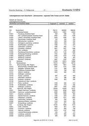 Drucksache 19/12512 – 28 – Deutscher Bundestag – 19. Wahlperiode Lebendgeborene nach Geschlecht - Jahressumme - regionale Tiefe: Kreise und krfr. Städte Statistik der Geburten Lebendgeborene (Anzahl) Jahr/Kreise und kreisfreie Städte Insgesamt männlich weiblich 08421 Ulm, Stadtkreis 1313 690 623 08425 Alb-Donau-Kreis, Landkreis 1965 964 1001 08426 Biberach, Landkreis 2023 1045 978 08435 Bodenseekreis, Landkreis 1984 1060 924 08436 Ravensburg, Landkreis 2762 1393 1369 08437 Sigmaringen, Landkreis 1178 624 554 09 Bayern 125689 64503 61186 091 Oberbayern, Regierungsbezirk 48541 24799 23742 09161 Ingolstadt 1498 748 750 09162 München, Landeshauptstadt 17958 9170 8788 09163 Rosenheim 628 337 291 09171 Altötting, Landkreis 1061 524 537 09172 Berchtesgadener Land, Landkreis 882 487 395 09173 Bad Tölz-Wolfratshausen, Landkreis 1185 618 567 09174 Dachau, Landkreis 1515 786 729 09175 Ebersberg, Landkreis 1383 704 679 09176 Eichstätt, Landkreis 1430 713 717 09177 Erding, Landkreis 1336 701 635 09178 Freising, Landkreis 1836 917 919 09179 Fürstenfeldbruck, Landkreis 2142 1070 1072 09180 Garmisch-Partenkirchen, Landkreis 809 407 402 09181 Landsberg am Lech, Landkreis 1074 548 526 09182 Miesbach, Landkreis 908 472 436 09183 Mühldorf a.Inn, Landkreis 1105 562 543 09184 München, Landkreis 3326 1737 1589 09185 Neuburg-Schrobenhausen, Landkreis 978 502 476 09186 Pfaffenhofen a.d.Ilm, Landkreis 1252 631 621 09187 Rosenheim, Landkreis 2301 1132 1169 09188 Starnberg, Landkreis 1177 615 562 09189 Traunstein, Landkreis 1540 782 758 09190 Weilheim-Schongau, Landkreis 1217 636 581 092 Niederbayern, Regierungsbezirk 10836 5563 5273 09261 Landshut 725 375 350 09262 Passau 449 225 224 09263 Straubing 399 194 205 09271 Deggendorf, Landkreis 1017 524 493 09272 Freyung-Grafenau, Landkreis 642 310 332 09273 Kelheim, Landkreis 1203 621 582 09274 Landshut, Landkreis 1445 732 713 09275 Passau, Landkreis 1552 784 768 09276 Regen, Landkreis 642 339 303 09277 Rottal-Inn, Landkreis 1038 551 487 09278 Straubing-Bogen, Landkreis 879 472 407 09279 Dingolfing-Landau, Landkreis 845 436 409 093 Oberpfalz, Regierungsbezirk 9818 5033 4785 09361 Amberg 365 186 179 09362 Regensburg 1547 786 761 09363 Weiden i.d.OPf. 382 197 185 09371 Amberg-Sulzbach, Landkreis 793 421 372 09372 Cham, Landkreis 1134 592 542 Abgerufen am 29.07.19 / 17:32:18 Seite 17 von 45