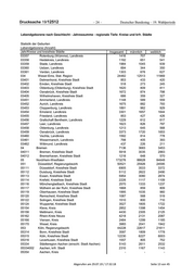 Deutscher Bundestag – 19. Wahlperiode – 23 – Drucksache 19/12512 Lebendgeborene nach Geschlecht - Jahressumme - regionale Tiefe: Kreise und krfr. Städte Statistik der Geburten Lebendgeborene (Anzahl) Jahr/Kreise und kreisfreie Städte Insgesamt männlich weiblich 2016 DG Deutschland 792131 405585 386546 01 Schleswig-Holstein 25420 12957 12463 01001 Flensburg, Kreisfreie Stadt 930 488 442 01002 Kiel, Landeshauptstadt, Kreisfreie Stadt 2592 1343 1249 01003 Lübeck, Hansestadt, Kreisfreie Stadt 2039 1065 974 01004 Neumünster, Kreisfreie Stadt 702 349 353 01051 Dithmarschen, Landkreis 1093 559 534 01053 Herzogtum Lauenburg, Landkreis 1868 934 934 01054 Nordfriesland, Landkreis 1388 714 674 01055 Ostholstein, Landkreis 1366 652 714 01056 Pinneberg, Landkreis 2927 1541 1386 01057 Plön, Landkreis 940 478 462 01058 Rendsburg-Eckernförde, Landkreis 2210 1125 1085 01059 Schleswig-Flensburg, Landkreis 1762 890 872 01060 Segeberg, Landkreis 2383 1233 1150 01061 Steinburg, Landkreis 1133 566 567 01062 Stormarn, Landkreis 2087 1020 1067 02 Hamburg 21480 10912 10568 03 Niedersachsen 75215 38471 36744 031 Braunschweig, Stat. Region 15000 7661 7339 03101 Braunschweig, Kreisfreie Stadt 2567 1272 1295 03102 Salzgitter, Kreisfreie Stadt 1101 569 532 03103 Wolfsburg, Kreisfreie Stadt 1432 769 663 03151 Gifhorn, Landkreis 1824 946 878 03152 Göttingen, Landkreis - - - 03153 Goslar, Landkreis 987 487 500 03154 Helmstedt, Landkreis 775 386 389 03155 Northeim, Landkreis 1068 563 505 03156 Osterode am Harz, Landkreis - - - 03157 Peine, Landkreis 1259 646 613 03158 Wolfenbüttel, Landkreis 1000 518 482 03159 Göttingen, Landkreis 2987 1505 1482 032 Hannover, Stat. Region 20549 10428 10121 03241 Region Hannover, Landkreis 11945 6036 5909 03241001 Hannover, Landeshauptstadt 6059 3085 2974 03251 Diepholz, Landkreis 1966 1006 960 03252 Hameln-Pyrmont, Landkreis 1306 679 627 03254 Hildesheim, Landkreis 2288 1221 1067 03255 Holzminden, Landkreis 584 293 291 03256 Nienburg (Weser), Landkreis 1103 522 581 03257 Schaumburg, Landkreis 1357 671 686 033 Lüneburg, Stat. Region 15184 7869 7315 03351 Celle, Landkreis 1640 821 819 03352 Cuxhaven, Landkreis 1632 883 749 03353 Harburg, Landkreis 2279 1187 1092 03354 Lüchow-Dannenberg, Landkreis 349 176 173 03355 Lüneburg, Landkreis 1726 892 834 03356 Osterholz, Landkreis 969 487 482 Abgerufen am 29.07.19 / 17:32:18 Seite 12 von 45