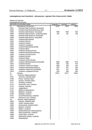 Drucksache 19/12512 – 32 – Deutscher Bundestag – 19. Wahlperiode Lebendgeborene nach Geschlecht - Jahressumme - regionale Tiefe: Kreise und krfr. Städte Statistik der Geburten Lebendgeborene (Anzahl) Jahr/Kreise und kreisfreie Städte Insgesamt männlich weiblich 14292 Kamenz, Landkreis - - - 143 Leipzig, Regierungsbezirk - - - 14365 Leipzig, Kreisfreie Stadt - - - 14374 Delitzsch, Landkreis - - - 14375 Döbeln, Landkreis - - - 14379 Leipziger Land, Landkreis - - - 14383 Muldentalkreis - - - 14389 Torgau-Oschatz, Landkreis - - - 145 Chemnitz, Stat. Region 12042 6207 5835 14511 Chemnitz, Stadt 2321 1188 1133 14521 Erzgebirgskreis 2779 1429 1350 14522 Mittelsachsen, Landkreis 2580 1355 1225 14523 Vogtlandkreis 1814 919 895 14524 Zwickau, Landkreis 2548 1316 1232 146 Dresden, Stat. Region 15252 7688 7564 14612 Dresden, Stadt 6467 3317 3150 14625 Bautzen, Landkreis 2632 1349 1283 14626 Görlitz, Landkreis 2017 988 1029 14627 Meißen, Landkreis 2027 988 1039 14628 Sächsische Schweiz-Osterzgebirge, Landkreis 2109 1046 1063 147 Leipzig, Stat. Region 10647 5522 5125 14713 Leipzig, Stadt 6983 3657 3326 14729 Leipzig, Landkreis 2059 1046 1013 14730 Nordsachsen, Landkreis 1605 819 786 15 Sachsen-Anhalt 18092 9335 8757 15001 Dessau-Roßlau, Kreisfreie Stadt 630 325 305 15002 Halle (Saale), Kreisfreie Stadt 2287 1199 1088 15003 Magdeburg, Kreisfreie Stadt 2401 1251 1150 15081 Altmarkkreis Salzwedel 706 365 341 15082 Anhalt-Bitterfeld, Landkreis 1199 614 585 15083 Börde, Landkreis 1432 742 690 15084 Burgenlandkreis 1437 755 682 15085 Harz, Landkreis 1545 791 754 15086 Jerichower Land, Landkreis 718 369 349 15087 Mansfeld-Südharz, Landkreis 977 495 482 15088 Saalekreis 1505 739 766 15089 Salzlandkreis 1483 762 721 15090 Stendal, Landkreis 885 466 419 15091 Wittenberg, Landkreis 887 462 425 151 Dessau, Stat. Region - - - 15101 Dessau, Kreisfreie Stadt - - - 15151 Anhalt-Zerbst, Kreis - - - 15153 Bernburg, Kreis - - - 15154 Bitterfeld, Kreis - - - 15159 Köthen, Kreis - - - 15171 Wittenberg, Kreis - - - 152 Halle, Stat. Region - - - 15202 Halle (Saale), Kreisfreie Stadt - - - 15256 Burgenlandkreis - - - 15260 Mansfelder Land, Kreis - - - Abgerufen am 29.07.19 / 17:32:18 Seite 21 von 45