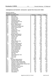 Drucksache 19/12512 – 38 – Deutscher Bundestag – 19. Wahlperiode Lebendgeborene nach Geschlecht - Jahressumme - regionale Tiefe: Kreise und krfr. Städte Statistik der Geburten Lebendgeborene (Anzahl) Jahr/Kreise und kreisfreie Städte Insgesamt männlich weiblich 07334 Germersheim, Landkreis 1146 586 560 07335 Kaiserslautern, Landkreis 953 478 475 07336 Kusel, Landkreis 542 286 256 07337 Südliche Weinstraße, Landkreis 901 465 436 07338 Rhein-Pfalz-Kreis 1309 689 620 07339 Mainz-Bingen, Landkreis 1847 926 921 07340 Südwestpfalz, Landkreis 725 369 356 08 Baden-Württemberg, Land 100269 50981 49288 081 Stuttgart, Regierungsbezirk 38674 19666 19008 08111 Stuttgart, Landeshauptstadt, Stadtkreis 6410 3261 3149 08115 Böblingen, Landkreis 3758 1954 1804 08116 Esslingen, Landkreis 4923 2508 2415 08117 Göppingen, Landkreis 2158 1111 1047 08118 Ludwigsburg, Landkreis 5535 2795 2740 08119 Rems-Murr-Kreis, Landkreis 3706 1908 1798 08121 Heilbronn, Stadtkreis 1235 637 598 08125 Heilbronn, Landkreis 3102 1566 1536 08126 Hohenlohekreis, Landkreis 967 455 512 08127 Schwäbisch Hall, Landkreis 1849 952 897 08128 Main-Tauber-Kreis, Landkreis 1059 539 520 08135 Heidenheim, Landkreis 1157 551 606 08136 Ostalbkreis, Landkreis 2815 1429 1386 082 Karlsruhe, Regierungsbzirk 24944 12714 12230 08211 Baden-Baden, Stadtkreis 445 248 197 08212 Karlsruhe, Stadtkreis 2937 1510 1427 08215 Karlsruhe, Landkreis 3709 1928 1781 08216 Rastatt, Landkreis 1955 1016 939 08221 Heidelberg, Stadtkreis 1467 744 723 08222 Mannheim, Stadtkreis 3002 1511 1491 08225 Neckar-Odenwald-Kreis, Landkreis 1170 586 584 08226 Rhein-Neckar-Kreis, Landkreis 4930 2479 2451 08231 Pforzheim, Stadtkreis 1356 672 684 08235 Calw, Landkreis 1315 684 631 08236 Enzkreis, Landkreis 1607 818 789 08237 Freudenstadt, Landkreis 1051 518 533 083 Freiburg, Regierungsbezirk 20041 10195 9846 08311 Freiburg im Breisgau, Stadtkreis 2431 1252 1179 08315 Breisgau-Hochschwarzwald, Landkreis 2320 1171 1149 08316 Emmendingen, Landkreis 1453 731 722 08317 Ortenaukreis, Landkreis 3797 1903 1894 08325 Rottweil, Landkreis 1290 670 620 08326 Schwarzwald-Baar-Kreis, Landkreis 1838 902 936 08327 Tuttlingen, Landkreis 1276 615 661 08335 Konstanz, Landkreis 2497 1301 1196 08336 Lörrach, Landkreis 1891 988 903 08337 Waldshut, Landkreis 1248 662 586 084 Tübingen, Regierungsbezirk 16610 8406 8204 08415 Reutlingen, Landkreis 2499 1264 1235 08416 Tübingen, Landkreis 2096 1065 1031 08417 Zollernalbkreis, Landkreis 1528 763 765 Abgerufen am 29.07.19 / 17:32:18 Seite 27 von 45