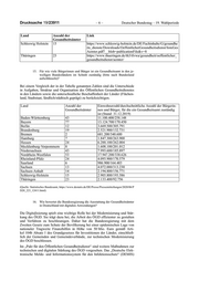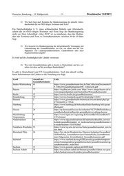Drucksache 19/23911 –6– Deutscher Bundestag – 19. Wahlperiode Land Anzahl der Link Gesundheitsämter Schleswig Holstein 15 https://www.schleswig-holstein.de/DE/Fachinhalte/G/gesundhe its_dienste/Downloads/OeffentlicherGesundheitsdienst/listeGes Aemter.pdf?__blob=publicationFile&v=8 Thüringen 23 https://www.thueringen.de/th3/tlvwa/gesundheit/oeffentlicher_ gesundheitsdienst/aemter/ 15. Für wie viele Bürgerinnen und Bürger ist ein Gesundheitsamt in den je- weiligen Bundesländern im Schnitt zuständig (bitte nach Bundesland aufschlüsseln)? Bei einem Vergleich der in der Tabelle genannten Zahlen sind die Unterschiede in Aufgaben, Struktur und Organisation des Öffentlichen Gesundheitsdienstes in den Ländern sowie die unterschiedliche Beschaffenheit der Länder (Flächen- land, Stadtstaat, ländlich/städtisch geprägt) zu berücksichtigen. Land Anzahl der Einwohnerzahl/durchschnittliche Anzahl der Bürgerin- Gesundheitsämter nen und Bürger, für die ein Gesundheitsamt zuständig ist (Stand: 31.12.2019) Baden-Württemberg 43 11.100.400/258.148 Bayern 77 13.124.700/170.450 Berlin 12 3.669.500/305.791 Brandenburg 19 2.521.900/132.731 Bremen 2 681.200/340.600 Hamburg 7 1.847.300/263.900 Hessen 24 6.288.100/262.004 Mecklenburg-Vorpommern 8 1.608.100/201.012 Niedersachsen 43 7.993.600/185.897 Nordrhein-Westfalen 53 17.947.200/338.626 Rheinland-Pfalz 24 4.093.900/170.579 Saarland 6 986.900/164.483 Sachsen 13 4.072.000/313.230 Sachsen-Anhalt 14 2.194.800/156.771 Schleswig-Holstein 15 2.903.800/193.586 Thüringen 23 2.133.400/92.756 (Quelle: Statistisches Bundesamt, https://www.destatis.de/DE/Presse/Pressemitteilungen/2020/06/P D20_223_12411.html) 16. Wie bewertet die Bundesregierung die Ausstattung der Gesundheitsämter in Deutschland mit digitalen Anwendungen? Die Digitalisierung spielt eine wichtige Rolle bei der Modernisierung und Stär- kung des ÖGD. Sie trägt dazu bei, die Arbeit des ÖGD effizienter zu gestalten und Verfahren zu beschleunigen. Daher hat die Bundesregierung mit dem Zweiten Gesetz zum Schutz der Bevölkerung bei einer epidemischen Lage von nationaler Tragweite Finanzhilfen in Höhe von 50 Mio. Euro gemäß Arti- kel 104b Absatz 1 des Grundgesetzes für Investitionen der Länder, einschließ- lich der Gemeinden und Gemeindeverbände, zur technischen Modernisierung des ÖGD beschlossen. Im „Pakt für den Öffentlichen Gesundheitsdienst“ sind weitere Maßnahmen zur technischen und digitalen Stärkung des ÖGD vorgesehen. Das „Deutsche Elek- tronische Melde- und Informationssystem für den Infektionsschutz“ (DEMIS)