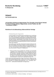 Deutscher Bundestag Drucksache 19/6827 19. Wahlperiode 02.01.2019 Antwort der Bundesregierung auf die Kleine Anfrage der Abgeordneten Tino Chrupalla, Armin-Paulus Hampel, Dr. Roland Hartwig, weiterer Abgeordneter und der Fraktion der AfD – Drucksache 19/6387 – Richtlinien für die Behandlung völkerrechtlicher Verträge Vorbemerkung der Fragesteller Laut Presseangaben war die Bundesregierung federführend an der Ausarbeitung des Globalen Pakts für sichere, geordnete und reguläre Migration beteiligt. (www.cicero.de/aussenpolitik/un-migrationspakt-sevim-dagdelen-bundesregierung- afd-jens-spahn/plus). Die Bundesregierung hat mehrfach erklärt, dass es sich bei dem Pakt um keinen völkerrechtlichen Vertrag handelt, und dass dieser Pakt rechtlich nicht bindend sei (www.csu-landesgruppe.de/themen/innen-und-bau-recht- und-verbraucherschutz/deutschland-hat-groesstes-interesse-internationaler- debatte-ueber-migration). Nach Auffassung der Fragesteller widerspricht die formale Gestaltung des Glo balen Pakts allerdings den formalen Vorgaben der Bundesregierung für Ver träge, die unterhalb der völkerrechtlich bindenden Vertragsschwelle liegen, wie sie in der vom Auswärtigen Amt herausgegebenen Richtlinie für die Behand lung völkerrechtlicher Verträge (RvV) festgelegt sind. 1. Hat das Auswärtige Amt der Aufnahme einer „Präambel“ sowie der Begriffe „verpflichten“ und „Verpflichtung(en)“, die im vorliegenden Entwurf des Globalen Pakts für eine sichere, geordnete und reguläre Migration knapp 90- mal vorkommen, vorbehaltlos zugestimmt, obwohl gemäß seinen eigenen Richtlinien für die Behandlung völkerrechtlicher Verträge (RvV), konkret in der Anlage H, diese Wortwahl für Vereinbarungen unterhalb der völker rechtlich bindenden Vertragsschwelle ausdrücklich untersagt wird? Auf die Antwort der Bundesregierung zu Frage 10 der Kleinen Anfrage der Frak tion der AfD auf Bundestagsdrucksache 19/6050 wird verwiesen. Ergänzend wird auf den Beschluss des Bundesverfassungsgerichts vom 7. Dezember 2018 – 2 BvQ 105/18 – (insbesondere Randnummer 16) hingewiesen. Die Antwort wurde namens der Bundesregierung mit Schreiben des Bundesministeriums des Auswärtigen Amts vom 21. Dezember 2018 übermittelt. Die Drucksache enthält zusätzlich – in kleinerer Schrifttype – den Fragetext.