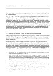 Wissenschaftliche Dienste Sachstand Seite 5 WD 2 – 3010 – 178/11 vanz zu. Ein in die Vereinten Nationen aufgenommener Staat wäre von allen ihren Mitgliedern als Staat zu behandeln. 5 Nach Art. 4 Abs. 2 der Charta der Vereinten Nationen (VN-Charta) erfolgt die Aufnahme neuer Mitglieder auf Empfehlung des Sicherheitsrats durch Beschluss der Generalversammlung. Die Empfehlung des Sicherheitsrats ist zwingende Voraussetzung für die Aufnahme eines Staates und unterliegt nach Art. 27 Abs. 3 VN-Charta dem Vetorecht der ständigen Mitglieder. Der In- 6 ternationale Gerichtshof hat zudem den erheblichen Spielraum der Mitglieder des Sicherheitsrats bei der Anwendung der Aufnahmekriterien betont. Eine feste Frist, innerhalb derer der Sicher- 7 heitsrat über eine Empfehlung entscheiden muss, besteht nicht. Üblicherweise wird ein Aufnah- mebegehren zunächst an einen Ausschuss des Sicherheitsrats verwiesen. Liegt eine Empfehlung 8 des Sicherheitsrats vor, so erfordert die Aufnahme eines neuen Mitglieds einen Beschluss der Generalversammlung, welcher einer Zweidrittelmehrheit der anwesenden und abstimmenden Staaten bedarf (Art. 18 Abs. 2 VN-Charta). 2.2. Bedeutung der Resolution „Uniting for Peace“ der Generalversammlung In Presseartikeln ist gelegentlich die Überlegung angeklungen, ob im Falle eines erwarteten Vetos durch die USA auf die sogenannte „Uniting for Peace“-Resolution aus dem Jahr 1950 zurückge- griffen werden könne, um einen Beschluss der Generalversammlung über die Anerkennung Pa- lästinas zu erreichen. 9 Mit ihrer Resolution 377 (V) vom 3. November 1950 („Uniting for Peace“-Resolution) bean- sprucht die Generalversammlung die Kompetenz, in Fällen internationaler Konflikte und zur Wahrung des Weltfriedens tätig zu werden, wenn der zuvörderst hierzu aufgerufene Sicherheits- rat aufgrund eines Vetos nicht handlungsfähig ist. Zudem wird niedergelegt, unter welchen Vo- raussetzungen die Generalversammlung außerordentliche Dringlichkeitssitzungen abhalten kann. Von dieser Möglichkeit hat die Generalversammlung im Laufe der Zeit wiederholt Gebrauch ge- macht. So wurde auch die Anforderung des Gutachtens des Internationalen Gerichtshofs zur 10 5 Delbrück (Anm. 6), S. 186; Hailbronner/Kau, Der Staat und der Einzelne als Völkerrechtssubjekte, in: Vitzthum (Hrsg.), Völkerrecht, 5. Auflage 2010, S. 147, Rn. 175. 6 Ginther, in Simma (Hrsg.), The Charter of the United Nations, 2. Auflage 2002, Art. 4 Rn. 30 f., siehe auch IGH, Competence of the General Assembly for the Admission of a State (Advisory Opinion), ICJ Reports (1950), 8-10. Die Auffassung des Richters Alvarez (abw. Meinung, ebenda, S. 19 ff.), der bei missbräuchlicher Anwendung des Vetorechts der Generalversammlung eine Entscheidungsbefugnis zubilligen wollte, hat sich nicht durchge- setzt. 7 IGH, Conditions of Admission of a State (Advisory Opinion), ICJ Reports (1948) 56. 8 Rule 59 der Rules of Procedure. Dies eröffnet nach verbreiteter Ansicht eine gewisse Möglichkeit, eine Ent- scheidung bis zum Abschluss von Verhandlungen zu vertagen. Hierbei dürfte eine Rolle spielen, ob der jüngste Zeitplan des Nahost-Quartetts umgesetzt werden kann. 9 Monath/Nüsse, Palästinenserstaat entzweit Berlin und Paris, in: Der Tagesspiegel, v. 5.5.2011, S. 4. 10 Ausführlich zum Ganzen Binder, Uniting for Peace Resolution (1950), in Wolfrum (Hrsg.), Max Planck Encyclo- pedia of Public International Law, online edition http://www.mpepil.com.