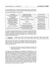 Drucksache 19/32662 –4– Deutscher Bundestag – 19. Wahlperiode d) Welche Vorbildung haben nach Kenntnis der Bundesregierung die Stu- dierenden in den Pflegestudiengängen? e) Inwiefern müssen nach Kenntnis der Bundesregierung Studieninteres- sierte ohne (fachgebundene) Hochschulzugangsberechtigung Eig- nungsprüfungen oder Ähnliches absolvieren, um zugelassen werden zu können? Die Fragen 1d und 1e werden im Zusammenhang beantwortet. Hierzu liegen der Bundesregierung keine Informationen vor. Die Zugangs- voraussetzungen zum Pflegestudium bestimmen sich verfassungsgemäß nach den jeweiligen landesrechtlichen Regelungen zum Hochschulzugang. 2. Welche konkreten Maßnahmen hat die Bundesregierung ergriffen, um gemeinsam mit den Bundesländern die Finanzierung der praktischen hochschulischen Pflegeausbildung nachhaltig zu sichern (vgl. https://nac hrichten.idw-online.de/2020/06/15/positionspapier-zur-primaerqualifizie renden-hochschulischen-pflegeausbildung-in-sachsen)? 3. Welche konkreten Maßnahmen hat die Bundesregierung ergriffen, um dringend benötigte pflegewissenschaftliche Studiengänge mit aufzu- bauen? Die Fragen 2 und 3 werden im Zusammenhang beantwortet. Mit Einführung der neuen Pflegeausbildungen zum 1. Januar 2020 besteht neben der beruflichen Pflegeausbildung erstmalig die Möglichkeit, auch im Rahmen eines Pflegestudiums einen primärqualifizierenden Abschluss zu er- werben. Das Hochschulrecht und die Einrichtung von Studiengängen liegt ver- fassungsrechtlich in der Zuständigkeit der Länder. Die Finanzierung erfolgt nach den allgemeinen Grundsätzen zur Finanzierung von Studiengängen grund- sätzlich durch die Länder. Das BMG und das BMFSFJ sind – insbesondere im Rahmen der „Ausbildungs- offensive Pflege (2019 bis 2023)“ – mit Ländern und Verbänden über die Mög- lichkeiten zur Stärkung der primärqualifizierenden hochschulischen Pflegeaus- bildung weiter im Gespräch. Die Partner der Ausbildungsoffensive Pflege haben insofern entsprechende Maßnahmen zur Stärkung der hochschulischen Pflegeausbildung beschlossen (siehe Vereinbarungen der „Ausbildungsoffensi- ve Pflege (2019 bis 2023)“, Handlungsfeld l, 1.4, Nummer 3). Die akademische Ausbildung wird ein Schwerpunkt des zweiten Berichts zur Ausbildungsoffen- sive Pflege sein der im Jahr 2022 vorgelegt werden wird. 4. Wie haben sich nach Kenntnis der Bundesregierung die Zahlen der Pro- motionsstudiengänge und Habilitationsmöglichkeiten in der Pflegewis- senschaft in Deutschland im internationalen Vergleich in den vergange- nen zehn Jahren entwickelt (bitte Anzahl der Plätze pro Jahr angeben)? Der Bundesregierung liegen keine internationalen Vergleichsdaten zur Ent- wicklung der Zahlen der Promotionsstudiengänge und Habilitationsmöglichkei- ten in der Pflegewissenschaft in Deutschland in den vergangenen zehn Jahren vor. Die nachfolgenden Zahlen beziehen sich auf den aktuellen Stand der Pro- motionsstudienangebote sowie die Entwicklung der abgeschlossenen Promotio- nen und Habilitationen im Studienfach Pflegewissenschaft/-management in Deutschland.