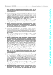 Drucksache 19/31008 –8– Deutscher Bundestag – 19. Wahlperiode Vorabfassung - wird durch die lektorierte Version ersetzt. Wenn keine, wie will die Bundesregierung betreffend der Shoah und NS konkret hier ihrer historischen Verantwortung im Bildungs- und Kulturbe- reich gerecht werden? 23. Welche Maßnahmen hat die Bundesregierung bisher ergriffen, um die von ExpertInnen aufgezeigten Mängeln in der LehrerInnenausbildung im Fach Geschichte mit Blick auf Antisemitismus, Antiziganismus und die NS-Zeit entgegenzuwirken und dadurch die Qualität der historischen Bildung im schulischen Kontext sicherzustellen (vgl. Wortprotokoll Fachgespräch im Ausschuss für Kultur und Medien, vom 16. Januar 2019, S. 15)? Wenn keine, wie will die Bundesregierung betreffend der Shoah und NS konkret hier ihrer historischen Verantwortung im Bildungs- und Kulturbe- reich gerecht werden? 24. Welchen Stellenwert hat nach Kenntnis der Bundesregierung die schüler- orientierte Vermittlung inklusive partizipativer Angebote zur Auseinander- setzung mit der Shoah sowie eine Zusammenarbeit mit Gedenkstätten in der LehrernInnenausbildung im Fach Geschichte? 25. Was hast die Bundesregierung in den vergangenen 10 Jahren unternom- men, um Gedenkstättenbesuche im Bereich der Erwachsenenbildung so- wie der beruflichen Weiterbildung, insbesondere auch bei der Polizei, der Bundeswehr, Ministerien und weitern staatlichen Institutionen und Behör- den zu fördern? Wenn nichts, wie will die Bundesregierung betreffend der Shoah und NS konkret hier ihrer historischen Verantwortung im Bildungs- und Kulturbe- reich gerecht werden? 26. Was hat die Bundesregierung bislang unternommen, um bundesgeförderte NS-Gedenkstätten dabei zu unterstützen, auch im Rahmen der Erwachse- nenbildung sowie beruflichen Weiterbildung zielgruppenspezifische Bil- dungsangebote zu entwickeln und umzusetzen und welche finanziellen Mittel wurden dafür zur Verfügung gestellt (u. a. mit Blick auf den Ausbau des Projekts „NS-Geschichte, Institutionen, Menschenrechte“ der Gedenk- stätten Neuengamme, welches sich explizit der Erarbeitung von berufs- gruppenspezifischen Bildungsmaterialien für Polizei, Justiz oder das Mili- tär widmet (vgl. Oliver Wrochem, 2015, Menschenrechtsbildung an Ge- denkstätten, die an nationalsozialistische Verbrechen erinnern, S. 142, in: Zentralen für politische Bildung, 2015, Gedenkstättenpädagogik – Kon- text, Theorie und Praxis der Bildungsarbeit zu NS-Verbrechen? Wenn nein, wie will die Bundesregierung betreffend der Shoah und NS konkret hier ihrer historischen Verantwortung im Bildungs- und Kulturbe- reich gerecht werden? 27. Was hat die Bundesregierung bisher unternommen, um der Überlastung der Mitarbeitenden in bundesgeförderten NS-Gedenkstätten, die u. a. durch die pädagogisch notwendige Ausweitung von Gedenkstättenbesu- chen auf mindestens drei Stunden bedingt ist, entgegenzuwirken (vgl. u. a. Stellungnahme von Prof. Dr. Jens-Christian Wagner, Stiftung niedersächsi- sche Gedenkstätten im Niedersächsischen Landtag zur Drucksache Nr. 17/3692)? Wenn nichts, wie will die Bundesregierung betreffend der Shoah und NS konkret hier ihrer historischen Verantwortung im Bildungs- und Kulturbe- reich gerecht werden? 28. Welche Maßnahmen hat die Bundesregierung bisher ergriffen, um die bun- desgeförderten NS-Gedenkstätten dabei zu unterstützen, angesichts des Verstummens von NS-Überlebenden, ihre eindrücklichen, für die politi-