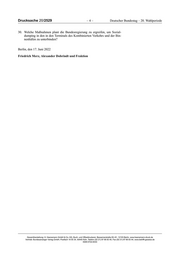 Drucksache 20/2529 –4– Deutscher Bundestag – 20. Wahlperiode 30. Welche Maßnahmen plant die Bundesregierung zu ergreifen, um Sozial- dumping in den in den Terminals des Kombinierten Verkehrs und der Bin- nenhäfen zu unterbinden? Berlin, den 17. Juni 2022 Friedrich Merz, Alexander Dobrindt und Fraktion Gesamtherstellung: H. Heenemann GmbH & Co. KG, Buch- und Offsetdruckerei, Bessemerstraße 83–91, 12103 Berlin, www.heenemann-druck.de Vertrieb: Bundesanzeiger Verlag GmbH, Postfach 10 05 34, 50445 Köln, Telefon (02 21) 97 66 83 40, Fax (02 21) 97 66 83 44, www.betrifft-gesetze.de ISSN 0722-8333
