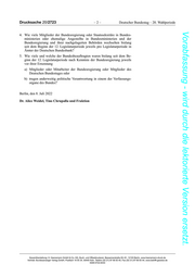 Drucksache 20/2723 –2– Deutscher Bundestag – 20. Wahlperiode Vorabfassung - wird durch die lektorierte Version ersetzt. 4. Wie viele Mitglieder der Bundesregierung oder Staatssekretäre in Bundes- ministerien oder ehemalige Angestellte in Bundesministerien und der Bundesregierung und ihrer nachgelagerten Behörden wechselten bislang seit dem Beginn der 12. Legislaturperiode jeweils pro Legislaturperiode in Ämter der Deutschen Bundesbank? 5. Wie viele und welche der Bundesbeauftragten waren bislang seit dem Be- ginn der 12. Legislaturperiode nach Kenntnis der Bundesregierung jeweils vor ihrer Ernennung a) Mitglieder oder Mitarbeiter der Bundesregierung oder Mitglieder des Deutschen Bundestages oder b) trugen anderweitig politische Verantwortung in einem der Verfassungs- organe des Bundes? Berlin, den 8. Juli 2022 Dr. Alice Weidel, Tino Chrupalla und Fraktion Gesamtherstellung: H. Heenemann GmbH & Co. KG, Buch- und Offsetdruckerei, Bessemerstraße 83–91, 12103 Berlin, www.heenemann-druck.de Vertrieb: Bundesanzeiger Verlag GmbH, Postfach 10 05 34, 50445 Köln, Telefon (02 21) 97 66 83 40, Fax (02 21) 97 66 83 44, www.betrifft-gesetze.de ISSN 0722-8333