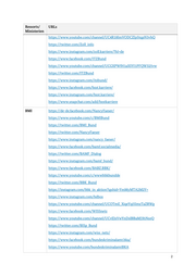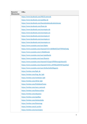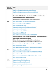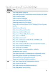 Antwort der Bundesregierung zur BT-Drucksache Nr. 20/1951: Anlage 1 Ressorts/ URLs Ministerien BMWK https://www.facebook.com/BMWK https://www.youtube.com/c/bundeswirtschaftsministerium/videos?app=desktop https://twitter.com/BMWK https://twitter.com/BMWK_Econ https://www.instagram.com/bmwk_bund/ https://www.instagram.com/robert.habeck/ https://www.youtube.com/channel/UCEPnKP7WMADulYZO_Ybqnvg?view_as=s ubscriber https://twitter.com/Kartellamt https://www.facebook.com/Netzausbau/ https://www.youtube.com/c/Netzausbau https://www.youtube.com/c/BundesnetzagenturP https://twitter.com/BNetzA https://twitter.com/netzausbau https://www.youtube.com/channel/UCuXmpW--tONnE0RYIXaKn8g https://twitter.com/BAFA_Bund https://www.youtube.com/c/bundesanstaltfurmaterialforschungundprufung https://twitter.com/bamresearch?lang=de https://twitter.com/MatChIng_BAM https://www.facebook.com/people/Physikalisch-Technische- Bundesanstalt/100027309056381/ https://www.youtube.com/c/PhysikalischTechnischeBundesanstalt/featured https://www.facebook.com/pages/BGR-Bundesanstalt-f%C3%BCr- Geowissenschaften-und-Rohstoffe/264011863636433 https://www.youtube.com/user/GeoChannelBgrLbeg BMF https://www.youtube.com/user/finanzministeriumTV/about https://twitter.com/BMF_Bund https://www.instagram.com/bundesfinanzministerium/ https://www.facebook.com/Zoll.Karriere/ 1