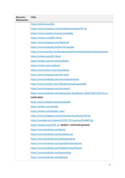 Ressorts/ URLs Ministerien https://twitter.com/bka https://www.instagram.com/bundeskriminalamt/?hl=de https://www.youtube.com/user/pressebkg https://twitter.com/BKG_Bund https://www.instagram.com/bkg.bund https://www.facebook.com/bsi.fuer.buerger https://www.youtube.com/BundesamtfürSicherheitinderInformationstechnik https://twitter.com/BSI_Bund https://twitter.com/ArneSchoenbohm https://twitter.com/certbund https://www.twitter.com/CyberAllianz https://www.instagram.com/bsi_bund https://www.facebook.com/muenzedeutschland https://www.youtube.com/c/BundesverwaltungsamtDE https://www.instagram.com/bva.bund/ https://www.facebook.com/Statistisches-Bundesamt-102167785211363/?ti=as (nicht aktiv) https://www.youtube.com/user/destatis https://twitter.com/destatis https://twitter.com/destatis_news https://www.instagram.com/statistisches.bundesamt/?hl=de https://youtube.com/channel/UCWT_PU-6uzDavyP5y6MUiXg https://twitter.com/ZITiS_de (inaktiv / wird nicht genutzt) https://www.facebook.com/bpb.de https://www.facebook.com/kinofenster.de https://www.facebook.com/werkstatt.bpb.de https://www.facebook.com/Jugenddemokratiepreis https://www.facebook.com/PolitikimFreienTheater https://www.facebook.com/histoconline https://www.facebook.com/bpbtimer 3