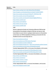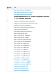 Ressorts/ URLs Ministerien https://www.instagram.com/thwlvnw/ https://www.instagram.com/thw.lv.herpsl/ https://www.instagram.com/thwbayern/ Instagram: Regionalstellen THW: ca. 7 Account, Ortsverbände ca. 105 Accounts Tik-Tok: Ortsverbände: ca. 9 Accounts AA https://www.facebook.com/AuswaertigesAmt/ https://www.youtube.com/user/AuswaertigesAmtDE https://twitter.com/AuswaertigesAmt https://www.instagram.com/auswaertigesamt/ https://twitter.com/Abaerbock https://www.instagram.com/abaerbock/ https://twitter.com/AA_Kultur https://twitter.com/AA_SicherReisen https://twitter.com/AA_stabilisiert https://twitter.com/GERClimatEnergy https://twitter.com/GermanyonBrexit https://twitter.com/GERonEurope https://twitter.com/GERMANYonUN https://twitter.com/GERonAfrica https://twitter.com/GERonAsia https://twitter.com/GERonEconomy https://twitter.com/GERonOstpolitik https://twitter.com/GERonStratCom https://twitter.com/planungsstab https://twitter.com/GERDigitalEnvoy https://twitter.com/GermanyOnMENA https://twitter.com/GermanyOnIntLaw https://twitter.com/GERonWEB https://twitter.com/GERonCyber https://twitter.com/AAdigitalisiert 7