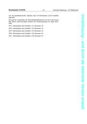 Deutscher Bundestag – 20. Wahlperiode –9– Drucksache 20/2735 Vorabfassung - wird durch die lektorierte Version ersetzt. lich tätig sind. Die Zahl der Mitglieder bleibt über die Jahre im Wesentlichen unverändert, kann indes aufgrund besonderer Schwerpunktsetzung im Jahres- verlauf leicht variieren. Die Satzungsversammlung verfügt in der 7. Legislaturperiode über insgesamt 118 Mitglieder, davon 91 stimmberechtigte Mitglieder. Sämtliche Mitglieder sind ehrenamtlich tätig. Die Legislaturperiode begann im Jahr 2019 und wird 2023 enden. Bundesnotarkammer: Bei der Bundesnotarkammer waren beziehungsweise sind wie folgt beschäftigt: • 2017: 123 bezahlt Beschäftigte, 8 hauptamtlich Beschäftigte, 7 ehrenamt- lich tätige Personen, • 2018: 155 bezahlt Beschäftigte, 9 hauptamtlich Beschäftigte, 7 ehrenamt- lich tätige Personen, • 2019: 189 bezahlt Beschäftigte, 10 hauptamtlich Beschäftigte, 7 ehrenamt- lich tätige Personen, • 2020: 188 bezahlt Beschäftigte, 11 hauptamtlich Beschäftigte, 7 ehrenamt- lich tätige Personen, • 2021: 201 bezahlt Beschäftigte, 14 hauptamtlich Beschäftigte, 9 ehrenamt- lich tätige Personen. Patentanwaltskammer: Bei der Patentanwaltskammer besteht der Vorstand gemäß Satzung aus acht- zehn ehrenamtlich tätigen Mitgliedern. In der Geschäftsstelle sind aktuell 17 Mitarbeiterinnen und Mitarbeiter entgeltlich beschäftigt. In den letzten fünf Jahren unterlag die Zahl der in der Geschäftsstelle Beschäftigten leichten Schwankungen, bewegte sich aber stets zwischen 17 und 19. Zur Zahl der Angestellten bei den Rechtsanwaltskammern und den Notarkam- mern liegen der Bundesregierung keine Informationen vor. Bundessteuerberaterkammer: Das Präsidium der Bundessteuerberaterkammer besteht aus dem Präsidenten, drei Vizepräsidenten und fünf weiteren Mitgliedern. Sie üben ihre Tätigkeit eh- renamtlich aus. Dies gilt auch für die Mitglieder der Ausschüsse. Die Einset- zung der Ausschüsse erfolgt durch die Bundeskammerversammlung. Die Zahl der Angestellten der Bundessteuerberaterkammer hat sich in den letz- ten fünf Jahren nach derzeitiger Kenntnis der Bundesregierung wie folgt entwi- ckelt: 2018: 36 Angestellte (davon 10 in Teilzeit), 2019: 37 Angestellte (davon 12 in Teilzeit), 2020: 35 Angestellte (davon 11 in Teilzeit), 2021: 37 Angestellte (vorläufig, davon 10 in Teilzeit), 2022: 38 Angestellte (vorläufig, davon 12 in Teilzeit). Handwerkskammern: Daten zu den Handwerkskammern liegen der Bundesregierung nicht vor. Wirtschaftsprüferkammer: Ehrenamtlich arbeiten für die Wirtschaftsprüferkammer 70 Personen, wobei da- von 13 Personen im Vorstand tätig sind, 57 im Beirat und 15 in der Kommis-