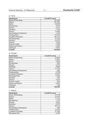 Deutscher Bundestag – 20. Wahlperiode – 11 – Drucksache 20/2507 p) Italien Bundesland Anzahl Personen Baden-Württemberg 181.905 Bayern 107.538 Berlin 34.659 Brandenburg 2.070 Bremen 2.471 Hamburg 7.574 Hessen 74.440 Mecklenburg-Vorpommern 1.545 Niedersachsen 29.129 Nordrhein-Westfalen 142.167 Rheinland-Pfalz 31.452 Saarland 18.237 Sachsen 4.202 Sachsen-Anhalt 1.394 Schleswig-Holstein 6.070 Thüringen 1.991 Gesamt 646.844 q) Portugal Bundesland Anzahl Personen Baden-Württemberg 28.805 Bayern 12.981 Berlin 6.982 Brandenburg 489 Bremen 2.535 Hamburg 9.069 Hessen 15.274 Mecklenburg-Vorpommern 280 Niedersachsen 8.778 Nordrhein-Westfalen 37.687 Rheinland-Pfalz 8.726 Saarland 954 Sachsen 1.652 Sachsen-Anhalt 963 Schleswig-Holstein 2.985 Thüringen 568 Gesamt 138.728 r) Spanien Bundesland Anzahl Personen Baden-Württemberg 25.979 Bayern 25.287 Berlin 17.123 Brandenburg 1.178 Bremen 2.081 Hamburg 6.037 Hessen 28.135 Mecklenburg-Vorpommern 856 Niedersachsen 12.422 Nordrhein-Westfalen 53.749 Rheinland-Pfalz 6.599