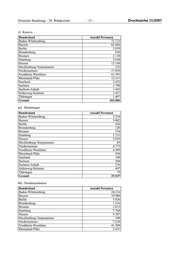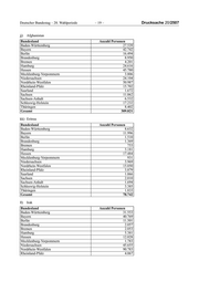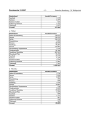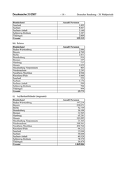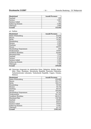 Drucksache 20/2507 – 14 – Deutscher Bundestag – 20. Wahlperiode Bundesland Anzahl Personen* Saarland 6.672 Sachsen 8.902 Sachsen-Anhalt 6.645 Schleswig-Holstein 14.912 Thüringen 6.244 Gesamt 1.004.812 * Dabei wurden 12 708 Personen mit Staatsangehörigkeit Serbien (ehemals) und 20 062 Personen mit Staatsangehörigkeit Serbien und Montenegro (ehemals) berücksichtigt. x) Albanien Bundesland Anzahl Personen Baden-Württemberg 13.041 Bayern 14.437 Berlin 3.682 Brandenburg 1.323 Bremen 2.467 Hamburg 2.472 Hessen 7.214 Mecklenburg-Vorpommern 459 Niedersachsen 8.028 Nordrhein-Westfalen 24.703 Rheinland-Pfalz 4.683 Saarland 726 Sachsen 2.096 Sachsen-Anhalt 1.315 Schleswig-Holstein 2.364 Thüringen 1.348 Gesamt 90.358 y) Bosnien und Herzegowina Bundesland Anzahl Personen Baden-Württemberg 46.173 Bayern 65.003 Berlin 12.710 Brandenburg 1.161 Bremen 1.464 Hamburg 4.130 Hessen 24.336 Mecklenburg-Vorpommern 427 Niedersachsen 8.599 Nordrhein-Westfalen 44.147 Rheinland-Pfalz 7.637 Saarland 1.654 Sachsen 978 Sachsen-Anhalt 1.064 Schleswig-Holstein 1.992 Thüringen 592 Gesamt 222.067