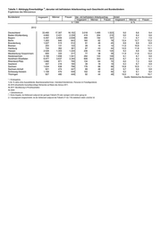 1) Tabelle 1: Abhängig Erwerbstätige , darunter mit befristetem Arbeitsvertrag nach Geschlecht und Bundesländern Ergebnisse des Mikrozensus Bundesland Insgesamt Männer Frauen dar. mit befristetem Arbeitsvertrag Anteil Insgesamt Männer Frauen Insgesamt Männer Frauen in 1.000 in % 2012 Deutschland 33.460 17.307 16.152 3.018 1.495 1.523 9,0 8,6 9,4 Baden-Württemberg 4.660 2.421 2.239 419 204 215 9,0 8,4 9,6 Bayern 5.497 2.859 2.638 390 192 197 7,1 6,7 7,5 Berlin 1.283 640 643 160 82 78 12,4 12,7 12,2 Brandenburg 1.027 515 512 91 46 45 8,9 8,9 8,9 Bremen 253 131 122 28 14 14 11,0 10,9 11,1 Hamburg 724 362 361 87 43 44 12,0 11,8 12,1 Hessen 2.528 1.303 1.224 236 116 120 9,3 8,9 9,8 Mecklenburg-Vorpommern 650 333 317 77 38 39 11,9 11,6 12,2 Niedersachsen 3.199 1.658 1.541 292 144 149 9,1 8,7 9,6 Nordrhein-Westfalen 6.977 3.637 3.340 606 303 303 8,7 8,3 9,1 Rheinland-Pfalz 1.666 871 795 134 64 70 8,0 7,3 8,8 Saarland 407 216 190 38 19 19 9,3 8,7 9,9 Sachsen 1.634 838 796 176 88 88 10,8 10,5 11,1 Sachsen-Anhalt 921 474 447 89 46 44 9,7 9,6 9,8 Schleswig-Holstein 1.108 570 539 102 52 50 9,2 9,1 9,4 Thüringen 927 480 448 92 44 48 10,0 9,2 10,7 Quelle: Statistisches Bundesamt * = Erstergebnis. 1) Ab 15 Jahre ohne Auszubildende, Beamtenanwärter/innen, Volontäre/Volontärinnen, Personen im Freiwilligendienst. Ab 2016 aktualisierte Auswahlgrundlage Stichprobe auf Basis des Zensus 2011. Ab 2017: Bevölkerung in Privathaushalten. Ab 2020: _ = Zeitreihenbruch. / = Keine Angabe, da Zahlenwert aufgrund der geringen Fallzahl (70 oder weniger) nicht sicher genug ist. () = Aussagewert eingeschränkt, da der Zahlenwert aufgrund der Fallzahl (71 bis 119) statistisch relativ unsicher ist.