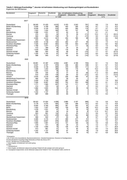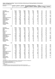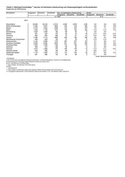 1) Tabelle 3: Abhängig Erwerbstätige , darunter mit befristetem Arbeitsvertrag nach Staatsangehörigkeit und Bundesländern Ergebnisse des Mikrozensus Bundesland Insgesamt Deutsche Ausländer dar. mit befristetem Arbeitsvertrag Anteil Insgesamt Deutsche Ausländer Insgesamt Deutsche Ausländer in 1.000 in % 2012 Deutschland 32.940 30.218 2.721 3.094 2.678 416 9,4 8,9 15,3 Baden-Württemberg 4.559 3.997 562 436 346 89 9,6 8,7 15,9 Bayern 5.370 4.842 529 410 343 67 7,6 7,1 12,7 Berlin 1.246 1.109 137 148 124 24 11,9 11,2 17,5 Brandenburg 1.025 1.009 16 98 95 / 9,5 9,4 / Bremen 251 225 27 29 23 6 11,6 10,4 21,4 Hamburg 693 605 88 72 61 11 10,4 10,1 12,8 Hessen 2.480 2.172 308 238 190 48 9,6 8,7 15,6 Mecklenburg-Vorpommern 648 639 10 77 76 / 11,9 11,8 / Niedersachsen 3.140 2.968 172 287 257 31 9,1 8,6 17,7 Nordrhein-Westfalen 6.909 6.285 624 631 541 90 9,1 8,6 14,4 Rheinland-Pfalz 1.644 1.526 119 143 126 17 8,7 8,3 14,6 Saarland 398 372 26 36 32 / 9,1 8,6 / Sachsen 1.616 1.589 27 185 178 7 11,5 11,2 27,2 Sachsen-Anhalt 923 908 15 98 94 / 10,6 10,4 / Schleswig-Holstein 1.116 1.065 51 113 104 9 10,1 9,8 17,3 Thüringen 921 908 14 93 89 / 10,1 9,8 / Quelle: Statistisches Bundesamt *=Erstergebnis. 1) Ab 15 Jahre ohne Auszubildende, Beamtenanwärter/innen, Volontäre/Volontärinnen, Personen im Freiwilligendienst. Ab 2016 aktualisierte Auswahlgrundlage Stichprobe auf Basis des Zensus 2011. Ab 2017: Bevölkerung in Privathaushalten. / = keine Angaben, da Zahlenwert nicht sicher genug Ab 2020: _ = Zeitreihenbruch. / = Keine Angabe, da Zahlenwert aufgrund der geringen Fallzahl (70 oder weniger) nicht sicher genug ist. () = Aussagewert eingeschränkt, da der Zahlenwert aufgrund der Fallzahl (71 bis 119) statistisch relativ unsicher ist.