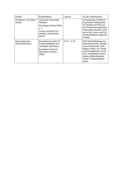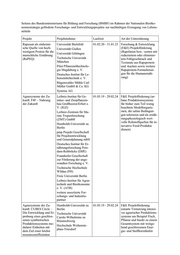 Seitens des Bundesministeriums für Bildung und Forschung (BMBF) im Rahmen der Nationalen Bioöko- nomiestrategie geförderte Forschungs- und Entwicklungsprojekte zur nachhaltigen Erzeugung von Lebens- mitteln Projekt Projektnehmer Laufzeit Art der Unterstützung Rapssaat als einheimi- Universität Bielefeld 01.02.20 - 31.01.23 Forschung & Entwicklung sche Quelle von hoch- Universität Gießen (F&E) Projektförderung wertigem Protein für die (Rapslinien bzw. -sorten mit Universität Göttingen menschliche Ernährung reduziertem oder eliminier- (RaPEQ) Technische Universität tem Fehlgeschmack und München Texturate aus Rapsprotein Pilot Pflanzenöltechnolo- und -kuchen sowie weitere gie Magdeburg e. V. Rapsprotein-Formulierun- Deutsches Institut für Le- gen für die Humanernäh- bensmitteltechnik e. V. rung) Rügenwalder Mühle Carl Müller GmbH & Co. KG Symrise AG Agrarsysteme der Zu- Leibniz-Institut für Ge- 01.03.19 - 29.02.24 F&E Projektförderung (ur- kunft: F4F – Nahrung müse- und Zierpflanzen- bane Produktionssysteme der Zukunft bau Großbeeren/Erfurt e. für bisher zum Teil wenig V. (IGZ) beachtete Modellorganis- Leibniz-Zentrum für Ma- men, die saline Bedingun- rine Tropenforschung gen tolerieren und als ernäh- (ZMT) GmbH rungsphysiologisch wert- volle Rohstoffquellen für in- Humboldt-Universität zu novative Food-Produkte Berlin dienen) pmp Projekt Gesellschaft für Projektentwicklung und Generalplanung mbH Deutsches Institut für Er- nährungsforschung Pots- dam-Rehbrücke (DIfE) Fraunhofer-Gesellschaft zur Förderung der ange- wandten Forschung e. V. Technische Hochschule Wildau (FH) Freie Universität Berlin Leibniz-Institut für Agrar- technik und Bioökonomie e. V. (ATB) weitere assoziierte For- schungs- und Industrie- partner Agrarsysteme der Zu- Humboldt-Universität zu 01.03.19 - 29.02.24 F&E Projektförderung kunft: CUBES Circle ‒ Berlin (smarte Vernetzung intensi- Die Entwicklung und Er- Technische Universität ver agrarischer Produktions- probung eines geschlos- Carolo-Wilhelmina zu systeme am Beispiel Fisch, senen symbiotischen Braunschweig Pflanze und Insekt zu einem Produktionssystems mo- Gesamtsystem mit weitge- Hochschule Weihenste- dularer Einheiten mit hend geschlossenen Ener- phan-Triesdorf dem Ziel einer höchst gie- und Stoffkreisläufen ressourceneffizienten
