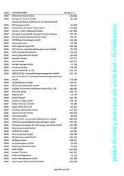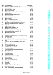 LAND UNTERNEHMEN Betrag in € NRW Schreinerei Beck GmbH 104.866 NRW Schugoma System GmbH 82.709 Schulte Strathaus GmbH & Co. KG Fördertechnik NRW Dichtungssysteme 25.000 Vorabfassung - wird durch die lektorierte Fassung ersetzt NRW Schumacher Precision Tools GmbH 171.000 NRW Schütz + Licht Prüftechnik GmbH 437.968 NRW Schwank Gesellschaft mit beschränkter Haftung 151.972 NRW Schwartmanns Maschinenbau GmbH 98.071 NRW SCHWING Technologies GmbH 152.000 NRW Screwerk GmbH 20.396 NRW SDA-engineering GmbH 349.089 NRW SDC Service- und Dienstleistungs-Center GmbH 93.250 NRW SEKO Staubtechnik GmbH 120.559 NRW sema Systemtechnik GmbH 133.000 NRW Sensatec GmbH 132.252 NRW sensis GmbH 369.017 NRW Sensors Europe GmbH 17.130 NRW sentenso GmbH 119.560 NRW Sentias GmbH & Co. KG 101.372 NRW SERVICEPOOL Instandhaltungsmanagement GmbH 107.111 serv-o-tec Druck- und Papierverarbeitungsmaschinen NRW GmbH 173.500 NRW SeSaM-Biotech GmbH 124.471 NRW SETOLITE Lichttechnik GmbH 86.631 NRW Seybold Technische Konfektion GmbH & Co. KG 180.000 NRW SHS plus GmbH 625.712 NRW SIBA GmbH 74.770 NRW SIDACT GmbH 162.742 NRW Siebdruck Jäger GmbH 170.570 NRW Siebel Elektronik GmbH 78.398 NRW Siepe GmbH & Co.KG 80.955 NRW Silcarbon Aktivkohle GmbH 127.837 NRW Silence Aircraft GmbH 190.879 NRW SilverSky GmbH 69.032 NRW SIM Scientific Instruments Manufacturer GmbH 490.014 NRW SIMCON kunststofftechnische Software GmbH 267.654 NRW SimpaTec Simulation & Technology Consulting GmbH 141.493 NRW Sirah Lasertechnik GmbH 171.000 NRW SITRAPLAS GmbH 60.485 NRW Situs Technicals GmbH 168.290 NRW SK Industriemodell GmbH 345.555 NRW skillbyte GmbH 188.415 NRW sk-werkzeugbau GmbH 16.920 NRW SLCR-Lasertechnik GmbH 71.301 NRW S+M GmbH 162.000 NRW Smake IT GmbH 261.102 NRW Smart Drilling GmbH 11.214 NRW Smart Mechatronics GmbH 152.000 NRW smart optics Sensortechnik GmbH 291.839 Seite 49 von 197