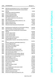 LAND UNTERNEHMEN Betrag in € NRW WHO Reinraumtechnik Inh. Prof. Dr. Horst Weißsieker 197.494 WIAG Antriebstechnik Gesellschaft mit beschränkter NRW Haftung 19.002 Vorabfassung - wird durch die lektorierte Fassung ersetzt Wiegershaus GmbH Ganzheitliche NRW Unternehmensgestaltung 134.756 NRW Wierig Profiltechnik GmbH 170.957 NRW WILDDESIGN GmbH & Co. KG 163.073 Wilh. Becker GmbH & Co. KG, Hahnreiter NRW Gewindetechnik 107.978 NRW Wilh. Schlechtendahl & Söhne GmbH & Co. KG 88.997 NRW Wilhelm Kötterheinrich 150.000 NRW Wilhelm Schröder GmbH 17.806 NRW Willy Remscheid Galvanische Anstalt GmbH 146.220 NRW Winkelnkemper Gesellschaft mit beschränkter Haftung 158.580 NRW WIPA Werkzeug- und Maschinenbau GmbH 147.125 Wippermann junior Gesellschaft mit beschränkter NRW Haftung 105.000 NRW wirbauen.digital GmbH 99.368 NRW Wi.Tec Sensorik GmbH 226.862 NRW Wi.Tec-Sensorik GmbH 137.241 NRW WIWOX GmbH Surface Systems 126.667 NRW WKI Absaugtechnik GmbH 411.953 Wolfgang Block Industrie- und Gartenbau GmbH & Co. NRW KG 310.851 Wolfram Ungermann Systemkälte GmbH & Co. NRW Kommanditgesellschaft 318.352 NRW WPS Group Technologies GmbH 309.999 NRW WPX Faserkeramik GmbH 268.111 NRW WRW Pipes GmbH 209.607 NRW WRW Westfälische Rohrwerke GmbH 326.175 NRW WS Produktentwicklung GmbH & Co. KG 186.430 NRW WSK Maschinenbau GmbH 152.000 NRW WSP Gesellschaft mit beschränkter Haftung 108.570 WSP Werner Sett & Partner Gesellschaft für NRW BüroPlanung und -Einrichtung mbH 69.300 NRW WULFF GmbH u. Co. KG 133.000 NRW Wurstspezialitäten Esser e.K. 196.241 NRW WZR ceramic solutions GmbH 523.899 NRW W2 Armaturen GmbH 264.600 NRW w3logistics AG 145.945 NRW XanTec bioanalytics GmbH 171.000 NRW XAPTec GmbH 232.210 NRW xax managing data & information GmbH 54.844 NRW Zauberzeug GmbH 118.077 NRW Zeschky Galvanik GmbH & Co. KG 5.134 NRW ZIEGLER-Instruments GmbH 29.610 NRW Zimmermann Engineering GmbH & Co. KG 171.000 Seite 54 von 197