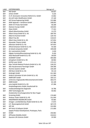 LAND UNTERNEHMEN Betrag in € BAY AID GmbH 60.937 BAY aimecs GmbH 5.225 BAY A.I.R. Aeronautic Innovation Rühle & Co. GmbH 13.062 BAY Aircraft Cabin Modification GmbH 37.169 BAY AJF Group Engineering GmbH 122.686 BAY AKW Apparate + Verfahren GmbH 148.003 BAY AKW A+V Protec Rail GmbH 40.349 BAY Alantum Europe GmbH 145.824 BAY Alaxo GmbH 77.321 BAY Albach-Maschinenbau GmbH 12.275 BAY Albani Group GmbH & Co. KG 184.703 BAY Albert & Hummel GmbH 129.733 BAY Albert Frey AG 110.615 BAY Albert-Haus GmbH & Co. KG 137.854 BAY Alexander Thamm GmbH 147.086 BAY alfavision GmbH & Co. KG 167.655 BAY Alfred Schweizer GmbH & Co. KG 45.500 BAY all ahead composites GmbH 199.648 BAY ALL Lasersysteme GmbH 2.430 BAY Allgaier Kunststoffverarbeitung GmbH & Co. KG 9.203 BAY Allod Werkstoff GmbH & Co. KG 28.829 BAY ALMAMET GmbH 304.000 BAY almapharm GmbH & Co. KG 40.963 BAY ALPHA Laser GmbH 175.212 BAY Alpo Technik Medical Products GmbH & Co. KG 128.232 BAY Alte Hausbrennerei Penninger GmbH 144.396 BAY Alumina Systems GmbH 130.209 BAY AM Brain GmbH & Co. KG 59.110 BAY Ambright GmbH 411.360 BAY Ambros Schmelzer & Sohn GmbH & Co. KG 111.966 BAY AMIPLANT GmbH 164.121 BAY amitronics Angewandte Mikromechatronik GmbH 305.575 BAY AMM GmbH 81.149 BAY amo-Asphalt GmbH & Co. KG 67.286 AmplexDiagnostics GmbH, Gesellschaft für BAY molekularbiologische Diagnostik 16.786 BAY AMS Technologies AG 59.492 Analytisches Forschungsinstitut für Non-Target BAY Screening GmbH 174.460 BAY Andreas Thaler GmbH & Co. KG 151.944 BAY ANGERMEIER INGENIEURE GmbH 45.065 BAY Anlagen- und Behälterbau Riedel GmbH & Co. KG 17.873 BAY A.P. Bioenergietechnik GmbH 187.579 BAY APC AG 152.000 BAY API Hard- & Software GmbH 171.000 apppex Product Development, Prototypes, Parts BAY GmbH 250.082 BAY APPsolute Mobility GmbH 210.813 BAY Apurano Life Sciences GmbH 24.564 Seite 110 von 197
