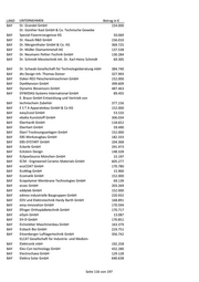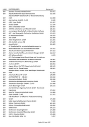 LAND UNTERNEHMEN Betrag in € BAY Apurano Pharmaceuticals GmbH 379.411 BAY AQUACHEM GmbH Separationstechnik 162.426 AQUA-CONCEPT Gesellschaft für Wasserbehandlung BAY mbH 152.000 BAY Ara-Coatings GmbH & Co. KG 13.449 BAY A.R.C. Laser GmbH 151.957 BAY arculus GmbH 112.184 BAY ARIES Embedded GmbH 169.997 BAY AROTEC Automation und Robotik GmbH 106.841 BAY ars navigandi Gesellschaft mit beschränkter Haftung 171.000 BAY ART - Axel Rosenwirth Technische Konfektion GmbH 174.915 BAY AS Automation GmbH 145.593 BAY ASC GmbH 342.000 BAY ASCO Biegetechnik GmbH 151.201 BAY ASG Analytik-Service AG 174.625 BAY Assyst GmbH 261.865 AT Gesellschaft für technische Realisierungen im BAY Bereich Bootsbau und Kunststofftechnik mbH 154.782 BAY Atec Automatisierungstechnik GmbH 377.163 BAY Atoma Gesellschaft für automatische Waagen GmbH 112.517 BAY ATR Software GmbH 6.970 ATV-Technologie GmbH Entwicklung und Vertrieb von BAY Maschinen und Geräten für die Mikro-Elektronik 238.901 BAY ATW Aluminiumtechnik Weißenburg GmbH 360.000 BAY Auctores GmbH 150.361 BAY August & Jean HILPERT Klärwerkstechnik GmbH 102.145 BAY Autark Inh. Dr. Georg Gruber 180.481 Autogen-Ritter, Johann Ritter Nachfolger Gesellschaft BAY mbH 611.015 BAY Automatic Research GmbH 170.999 BAY AUTOMATION W + R GmbH 159.532 BAY AutomationsRobotic GmbH 289.588 BAY Automotive Management Consulting GmbH 79.399 BAY Automotive Synergies GmbH & Co. KG 214.499 BAY Awite Bioenergie GmbH 156.572 Axel Christmann Ingenieurtechnik GmbH - Beratende BAY Ingenieure 279.852 BAY AxynTeC Dünnschichttechnik GmbH 114.800 BAY Azett GmbH & Co. KG 212.432 B & W Software für effiziente Produktentwicklung BAY GmbH 171.000 BAY babic Bayerische Bitumen-Chemie GmbH 77.089 BAY Bahner Elektronik GmbH 465.369 BAY Bahner Feinwerktechnik GmbH 169.956 BAY BAM GmbH 376.273 BAY Barthmann Recycling GmbH 171.000 BAY Barthmann-Kunststoff-Recycling GmbH 415.465 BAY B.A.S.E. Solution GmbH 125.000 BAY Bau-Fritz GmbH & Co. KG 5.057 Seite 111 von 197