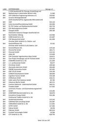 LAND UNTERNEHMEN Betrag in € BWT ZinCo GmbH 119.518 BWT ZK Sondermaschinen Inh. Kruno Zivkovic 72.678 BWT Z-LASER GmbH 195.188 BWT Zoller & Fröhlich GmbH 348.683 BWT Zuber Beton GmbH 152.000 BWT Zubler Gerätebau GmbH 151.738 BWT ZUE - Zwirnerei Untereggingen GmbH 150.859 BWT Zürn Harvesting GmbH & Co. KG 83.162 BWT ZYMO Research Europe GmbH 268.203 BWT 1 A Autenrieth Kunststofftechnik GmbH & Co. KG 310.137 BWT 1. Wenz-Mechanik GmbH 161.344 BWT 2 D Debus & Diebold Meßsysteme GmbH 348.966 BWT 2E mechatronic GmbH & Co. KG 107.515 BWT 3 T GmbH & Co. KG 137.241 BWT 3D-Labs GmbH 149.850 BWT 3D-Laserdruck GbR 41.935 BWT 3P Technik Filtersysteme GmbH 299.190 BWT 314-Automation GmbH 150.750 BWT 4base lab GmbH - advanced molecular analysis 246.869 BWT 4MI GmbH 149.572 Geosystems Gesellschaft für Vertrieb und Installafion von Fernerkundungs- und Geoinformationssystemen BAY mbH 169.442 BAY A + O Kunststofftechnik GmbH 340.870 BAY AB Schlachthof GmbH + Co. KG 98.562 BAY Abele Ingenieure GmbH 180.000 BAY ABLER GmbH & Co. KG 377.756 BAY ABS Protection GmbH 170.756 BAY ABT e-Line GmbH 227.888 BAY acad group GmbH 123.393 BAY AcanChia UG (haftungsbeschränkt) & Co. KG 154.015 BAY Ackermann Saatzucht GmbH & Co. KG 168.969 ACS-Control- System GmbH Elektronische BAY Kontrollsysteme 66.716 BAY AdCo Engineering GW GmbH 63.562 BAY Additive Elements GmbH 28.612 BAY Adhesive Products GmbH 457.950 BAY adivo GmbH 219.475 BAY Adnan Atilgan Gartenbau 152.000 BAY adnymics GmbH 247.500 BAY AdPhos Digital Printing GmbH 293.592 BAY AdPhos Innovative Technologies GmbH 312.187 BAY Advanced Realtime Tracking GmbH & Co. KG 336.324 BAY ADVANTIQX Dr. Johannes Scherer 203.377 BAY AEE Aircraft Electronic Engineering GmbH 192.886 BAY aeris GmbH 254.895 BAY AEROLAS GmbH, Aerostatische Lager- Lasertechnik 674.406 BAY AERO-LASER Gesellschaft für Gasanalytik mbH 368.101 BAY Agile Robots AG 168.186 Seite 109 von 197