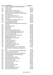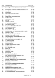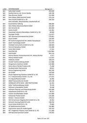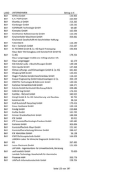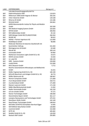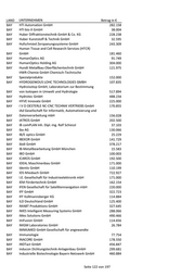 LAND UNTERNEHMEN Betrag in € Germes - Herstellung und Vertrieb chemo-techn. BAY Produkte GmbH 216.741 BAY Gerotor GmbH 130.287 BAY Gerstlauer Amusement Rides GmbH 148.540 BAY GERTEC Maschinen- und Anlagenbau GmbH 128.402 Gesellschaft für Planung, Maschinen- und Mühlenbau BAY Erhard Muhr mbH 146.812 BAY Geser Erdwärme GmbH & Co. KG 72.991 BAY GFD Gesellschaft für Diamantprodukte mbH 339.066 BAY GFH GmbH 459.532 BAY GHD-Präzisions-Formenbau GmbH & Co. KG 250.840 BAY GHS Separationstechnik GmbH 831.452 BAY GH-Tec Maschinenbau GmbH 133.000 GIGAHERTZ Optik Vertriebsgesellschaft für technische BAY Optik mbH 155.026 BAY Gigler Elektronik GmbH 160.325 BAY Gimbio GmbH 193.664 BAY gKteso GmbH 247.098 BAY GLENPRO Ingenieurgesellschaft mbH 152.392 BAY Glue Tec Industrieklebestoffe GmbH & Co. KG 133.000 BAY Glue Tec Industrieklebstoffe GmbH & Co. KG 203.791 BAY Gluth Systemtechnik GmbH 191.056 BAY GME German Medical Engineering GmbH 41.456 BAY Goalplay GmbH & Co. KG 297.760 BAY goodBIONICS Biotechnologie GmbH 164.934 BAY Gramm GmbH 71.784 BAY Graphite Materials GmbH 202.500 BAY Graupner Plastik GmbH 307.851 BAY Grimm Metallpulver GmbH 319.028 BAY GRUNDIG Business Systems GmbH 3.288 BAY Gruppe Matzdorf GmbH 120.231 BAY GS Elektromedizinische Geräte G. Stemple GmbH 172.888 GSR Gesellschaft für Steuerungs- und Regeltechnik BAY mbH 61.693 BAY GTW - Dr. Gebert Technologie und Wälzlager GmbH 211.655 BAY Gubesch Thermoforming GmbH 81.805 BAY GVE Viehbeck Engineering + Systemtechnik GmbH 140.342 BAY GWP Gesellschaft für Werkstoffprüfung mbH 413.762 BAY H. Steinhardt GmbH 109.246 BAY Haas Metallverarbeitung GmbH 134.500 BAY habemus! electronic + transfer GmbH 170.331 BAY Haber & Brandner GmbH 65.612 BAY Haberl Electronic GmbH & Co. KG 189.847 BAY Hacker Motor GmbH 144.000 BAY HA-CO Carbon GmbH 284.066 BAY Haderlein Werkzeugbau GmbH 61.677 BAY HAFI Beschläge GmbH 92.189 BAY Hager Sondermaschinenbau GmbH 146.390 BAY HALA Contec GmbH & Co. KG 117.678 Seite 120 von 197