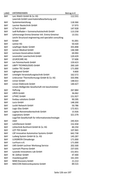 LAND UNTERNEHMEN Betrag in € BAY Lars Walch GmbH & Co. KG 112.531 LaserJob GmbH Lasermaterialbearbeitung und BAY Systementwicklung 118.366 BAY Laumer Bautechnik GmbH 57.973 BAY LCTech GmbH 147.928 BAY Ledl Rollladen + Sonnenschutztechnik GmbH 113.258 BAY Lehmorange Emma Gmeiner Inh. Emma Gmeiner 13.331 Leicht Structural engineering and specialist consulting BAY GmbH 91.001 BAY Leimer KG 50.420 BAY Leipfinger-Bader GmbH 355.898 BAY Lemon Medical GmbH 146.588 BAY Lermann Konstruktion GmbH 69.993 BAY Lessmüller Lasertechnik GmbH 120.429 BAY LEUKOCARE AG 57.606 BAY Lex Feinmechanik GmbH 159.423 BAY LIBIFY TECHNOLOGIES GmbH 260.169 BAY Liebler TEC GmbH 171.000 BAY Lightpanel GmbH 9.800 BAY Limelight Veranstaltungstechnik GmbH 162.572 BAY Linbrunner Thermoformungs-GmbH & Co. KG 333.996 BAY Linner GmbH 148.022 BAY Linner-Elektronik GmbH 140.427 Linseis Meßgeräte Gesellschaft mit beschränkter BAY Haftung 267.884 BAY LIROS GmbH 36.062 BAY LITHEC GmbH 151.927 BAY livebau solutions GmbH 90.595 BAY Locis GmbH 148.200 BAY Lockit Network GmbH 50.786 BAY Logic Glas GmbH 172.921 BAY Logitex Reinstmedientechnik GmbH 15.926 BAY Logivations GmbH 321.579 LogoTek Gesellschaft für Informationstechnologie BAY mbH 245.924 BAY LohrElement GmbH 152.458 BAY Löttechnik Burkhard GmbH & Co. KG 80.250 BAY LOT-TEK GmbH 107.965 BAY LSP Innovative Automotive Systems GmbH 642.738 BAY Ludwig System GmbH & Co. KG 145.287 BAY LUXGREEN Climadesign 171.000 BAY LuxYours e.K. 171.000 BAY LWS GmbH Lechner Werkzeug Service 202.500 BAY Lyomark Pharma GmbH 237.035 BAY Lysando Innovations Lab GmbH 151.831 BAY M. Zellner GmbH 47.400 BAY maasberg gmbh 161.203 BAY MAB Discovery GmbH 21.213 BAY MACCON Elektroniksysteme GmbH 89.515 Seite 126 von 197