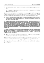 Landtag Brandenburg Drucksache 7/5790 zu Wellensittichen: „Diese sozialen Tiere müssen mindestens paarweise gehalten wer- den.“ zu Graupapageien: „Als soziale lebende Tiere müssen Graupapageien mindestens paarweise gehalten werden.“ Obwohl in Form von Richtlinien und Merkblättern eine Auslegung des § 2 Tierschutzgesetz möglich ist, handelt es sich hierbei nicht um allgemeinverbindliche Rechtsnormen. Sie sind demnach im Gegensatz zu Rechtsverordnungen nicht unmittelbar vollziehbares Recht. 4. Welche Haltungsvoraussetzungen gelten für die private und gewerbliche Haltung von Nutzkaninchen? Besteht eine Meldepflicht für Nutzkaninchenbestände und wenn ja, ab welcher Tierzahl gilt diese? Zu Frage 4: Wer Kaninchen zu Erwerbszwecken hält, muss die Anforderungen der Tier- schutznutztierhaltungsverordnung einhalten. Hier ist insbesondere der Abschnitt 6 „Anfor- derungen an das Halten von Kaninchen“ zu nennen. Von einem Erwerbszweck ist in der Regel auszugehen, wenn der Kaninchenbestand einen geringen Umfang übersteigt und die Nutzung der Tiere über den Eigenbedarf hinausgeht. Es ist eine Einzelfallentscheidung der Behörde, ob eine Kaninchenhaltung in den Anwendungsbereich der Tierschutznutztierver- ordnung fällt. Die private Kaninchenhaltung, die nicht Erwerbszwecken dient, fällt unter die allgemeinen Regelungen zur Tierhaltung im Tierschutzgesetz. Kaninchen sind demnach insbesondere ihrer Art und ihren Bedürfnissen entsprechend angemessen zu ernähren, zu pflegen und verhaltensgerecht unterzubringen. 5. Plant die Landesregierung in dieser Legislaturperiode die Erarbeitung einer Heimtier- verordnung zur artgerechten Haltung von Heimtieren? Zu Frage 5: Die Gesetzgebungskompetenz zum Erlass einer Verordnung mit näheren Best- immungen zur Haltung von Heimtieren liegt gemäß § 2a Tierschutzgesetz beim Bund. Ein entsprechendes Vorhaben des Bundes für Heimtiere würde von Seiten der Landesre- gierung begrüßt. -3-