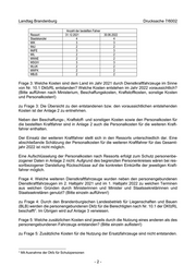 Landtag Brandenburg Drucksache 7/6002 Anzahl der bestellten Fahrer Ressort 31.12.2021 30.06.2022 Staatskanzlei 4 4 MIK 3 3 MdJ 2 2 MdFE 3 3 MIL 2 2 MWAE 2 2 MSGIV 3 3 MLUK 2 2 MWFK 2 2 MBJS 2 2 Frage 3: Welche Kosten sind dem Land im Jahr 2021 durch Dienstkraftfahrzeuge im Sinne von Nr. 10.1 DkfzRL entstanden? Welche Kosten entstehen im Jahr 2022 voraussichtlich? (Bitte aufführen nach Ministerium, Beschaffungskosten, Kraftstoffkosten, sonstige Kosten und Personalkosten!) zu Frage 3: Die Übersicht zu den entstandenen bzw. den voraussichtlichen entstehenden Kosten ist der Anlage 2 zu entnehmen. Neben den Beschaffungs-, Kraftstoff- und sonstigen Kosten sowie den Personalkosten für die bestellten Kraftfahrer sind in Anlage 2 auch die Personalkosten für die weiteren Kraft- fahrer enthalten. Der Einsatz der weiteren Kraftfahrer stellt sich in den Ressorts unterschiedlich dar. Eine abschließende Schätzung der Personalkosten für die weiteren Kraftfahrer für das Gesamt- jahr 2022 ist nicht möglich. Eine Aufschlüsselung der Personalkosten nach Ressorts erfolgt zum Schutz personenbe- zogener Daten in Anlage 2 nicht. Aufgrund des begrenzten Personenkreises wären bei res- sortbezogener Darstellung Rückschlüsse auf die konkreten Einkünfte der jeweiligen Kraft- fahrer möglich. Frage 4: Welche weiteren Dienstkraftfahrzeuge wurden neben den personengebundenen Dienstkraftfahrzeugen im 2. Halbjahr 2021 und im 1. Halbjahr 2022 zu welchen Terminen aus welchen Gründen durch Ministerinnen und Minister und Staatssekretärinnen und Staatssekretären genutzt? (Bitte einzeln aufführen!) zu Frage 4: Durch den Brandenburgischen Landesbetrieb für Liegenschaften und Bauen (BLB) werden die personengebundenen Dkfz für die Berechtigten nach Nr. 10.1 der DKfzRL 1 beschafft . Im Übrigen wird auf Anlage 3 verwiesen. Frage 5: Welche zusätzlichen Kosten sind jeweils durch die Nutzung eines anderen als des personengebundenen Fahrzeugs entstanden? (Bitte einzeln auflisten!) zu Frage 5: Zusätzliche Kosten für die Nutzung der Ersatzfahrzeuge sind nicht entstanden. 1 Mit Ausnahme der Dkfz für Schutzpersonen -2-