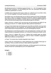 Landtag Brandenburg Drucksache 7/6002 Die Staatskanzlei hat für 3 Taxifahrten insgesamt Kosten i. H. v. 161,10 € angegeben. Diese Fahrten waren erforderlich, um die Einhaltung der Lenk- bzw. Ruhezeiten des jeweiligen Kraftfahrers gewährleisten zu können. Im MWFK sind im Dezember 2021 Kosten in Höhe von 1.209,04 € und im Juni 2022 in Höhe von 1.451,80 € angefallen. Die Kosten resultieren aus Anmietungen. Dem MSGIV sind in den Monaten Mai und Juni 2022 für Fahrten durch einen Fahrdienstlei- ster Kosten in Höhe von insgesamt 794,25 Euro entstanden. Aufgrund ungeplant längerfri- stiger Abwesenheiten der Kraftfahrer im MSGIV kam es zu einem personellen Engpass für die Führung des personengebundenen Dienstkraftfahrzeuges der Ministerin. Frage 6: Wie bzw. in welcher Form und durch wen wird die Einhaltung der DkfzRL für die Fahrzeuge im Sinne Nr. 10.1 DkftRL überprüft? (Bitte ausführlich beschreiben?) zu Frage 6: Eine Aufsicht über die Einhaltung der Vorschriften der DkfzRL durch das richtli- niengebende Ressort ist nicht vorgesehen. Zur Beachtung erhalten alle berechtigten Per- sonen entsprechende Hinweisschreiben durch das richtliniengebende Ressort. Die Staatskanzlei und die Ressorts greifen in den Leitungsbereichen und/oder in den Orga- nisationsreferaten auf geeignete Strukturen zur Prüfung der Einhaltung der DkfzRL zurück. Frage 7: Sind im 2. Halbjahr 2021 und im 1. Halbjahr 2022 Verstöße gegen die DkfzRL festgestellt worden? Wenn ja, welche? Wie wurde mit diesen Verstößen umgegangen? (Bitte einzeln aufführen und beschreiben!) zu Frage 7: Es wurden keine Verstöße festgestellt, siehe Frage 6. Frage 8: Plant die Landesregierung in dieser Wahlperiode des Landtages Änderungen an der DkfzRL? Wenn ja, welche und warum? (Bitte ausführlich begründen!) zu Frage 8: Hinsichtlich eines möglichen Änderungs- und Klärungsbedarfs ist die Meinungs- bildung innerhalb der Landesregierung noch nicht abgeschlossen. Anlage/n: 1. Anlage 1 2. Anlage 2 3. Anlage 3 -3-