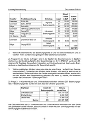 Landtag Brandenburg Drucksache 7/5818 Einzel- Preise Summe Hersteller Produktbezeichnung Einteilung Anzahl in EUR in EUR Löwenstein ELISA 500 18 20.000 360.000 High-End Löwenstein ELISA 800/600 31 20.000 620.000 Beatmungsgeräte Dräger Evita V600 43 28.500 1.225.500 Löwenstein VENTIlogic LS Klinikvariante 23 7.500 172.500 Dräger Savina 300 Life-support 28 18.500 518.000 Philips Trilogy Evo O2 Beatmungsgeräte 11 7.650 84.150 Fritz Stephan Eve IN 2 12.785 25.570 einfaches Löwenstein prismaVENT 50-C LM Beatmungsgerät 59 6.850 404.150 Notfall- Dräger Oxylog VE300 Beatmungsgerät 1 8.000 8.000 216 3.417.870 2. Welche Kosten fielen für die Beatmungsgeräte an und von welchen Akteuren und zu welchen Teilen wurden diese getragen? Bitte tabellarisch darstellen. Zu Frage 2: In der Tabelle zu Frage 1 sind in der Spalte 5 die Einzelpreise und in Spalte 6 die Summen der Geräte aufgeführt. Der Gesamtbetrag von 3.417.870 EUR wurde vom Mi- nisterium für Soziales, Gesundheit, Integration und Verbraucherschutz des Landes Bran- denburg an das Bundesministerium für Gesundheit gezahlt. 3. Welche märkischen Kliniken haben wie viele der unter Frage 1 aufgeführten Respira- toren erhalten? Entstanden den Kliniken dabei Kosten, und wenn ja, welche und in welcher Höhe? Falls die Kliniken die Geräte unentgeltlich erhalten haben, wurde dafür von den Kliniken eine Gegenleistung gefordert und wenn ja, welche, und inwieweit kamen die Kliniken den Forderungen nach? Zu Frage 3: 31 Krankenhäuser und 2 Rehabilitationskliniken erhielten 207 Beatmungsge- räte. 9 Beatmungsgeräte wurden im April 2022 der Ukraine gespendet. Empfänger Anzahl der Zahlung Beatmungsgeräte an den Bund 31 Krankenhäuser 202 3.316.770 EUR 2 Reha-Kliniken 5 36.200 EUR Ukraine-Hilfe 9 64.900 EUR Summe: 216 3.417.870 EUR Die Geschäftsführer der 31 Krankenhäuser und 2 Reha-Kliniken mussten nach dem Erhalt der gelieferten Geräte erklären, dass die Geräte in ihren Häusern ordnungsgemäß und be- stimmungsgemäß betrieben wurden. -2-