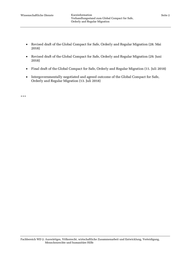 Wissenschaftliche Dienste Kurzinformation Seite 2 Verhandlungsstand zum Global Compact for Safe, Orderly and Regular Migration • Revised draft of the Global Compact for Safe, Orderly and Regular Migration (28. Mai 2018) • Revised draft of the Global Compact for Safe, Orderly and Regular Migration (29. Juni 2018) • Final draft of the Global Compact for Safe, Orderly and Regular Migration (11. Juli 2018) • Intergovernmentally negotiated and agreed outcome of the Global Compact for Safe, Orderly and Regular Migration (13. Juli 2018) *** Fachbereich WD 2: Auswärtiges, Völkerrecht, wirtschaftliche Zusammenarbeit und Entwicklung, Verteidigung, Menschenrechte und humanitäre Hilfe