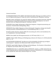 Literaturverzeichnis: BUNDESMINISTERIUM FÜR ARBEIT UND SOZIALES (2009). Wirkungen des SGB II auf Perso- nen mit Migrationshintergrund. Projekt IIa1-04/06. Abschlussbericht. Hauptband. Duisburg. BRUSSIG, Martin; DITTMAR, Vera; KNUTH, Matthias (2009). Verschenkte Potenziale. Fehlende Anerkennung von Qualifikationsabschlüssen erschwert die Erwerbsintegration von ALG-II- Bezieher/innen mit Migrationshintergrund. IAQ-Report 2009-08. FILSINGER, Dieter (2008). Bedingungen erfolgreicher Integration –Integrationsmonitoring und Evaluation. Friedrich-Ebert-Stiftung (Hrsg.), Bonn. HÖNEKOPP, Elmar (2008). Migranten auf dem Arbeitsmarkt. Integration verlangt mehr Qualifi- zierung und bessere Arbeitsmarktchancen. In: Personalführung, Heft 2, S. 21-29. RAASCH, Sybille; Rastetter, Daniela (2009). Die Anwendung des AGG in der betrieblichen Pra- xis. Projektbericht. Universität Hamburg. RIESEN, Ilona (2009). Der IW-Integrationsmonitor. In: IW-Trends, Heft 2, S. 1-17. SEIBERT, Holger (2008). Bildung und Einbürgerung verbessern die Chancen. In: IAB-Kurzbericht, Heft 17, S. 1-8. STATISTISCHES BUNDESAMT, Bevölkerung und Erwerbstätigkeit. Bevölkerung mit Migrati- onshintergrund – Ergebnisse des Mikrozensus 2008. Fachserie 1 Reihe 2.2. WILKENS, Ingrid (2008). Migration, Bildung und Beschäftigung – Die Situation in Deutschland. In: Migration und Soziale Arbeit, 30. Jg., Heft 3/4, S. ZIMMERMANN, Klaus F.; KAHANEC, Martin; CONSTANT, Amelie u.a. (2008). Studie über die soziale Eingliederung und Arbeitsmarktintegration ethnischer Minderheiten. In: Forschungsinsti- tut zur Zukunft der Arbeit (IZA), Research Report No. 16, Bonn.