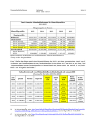 Wissenschaftliche Dienste Sachstand Seite 13 WD 8 - 3000 - 007/17 Entwicklung der Inlandsablieferungen für Mineralölprodukte 2011-2015 Mengenangaben in Tonnen Mineralölprodukte 2015 2014 2013 2012 2011 Hauptprodukte Rohbenzin 16.331.015 17.065.994 16.213.816 15.770.004 15.708.835 Ottokraftstoff 18.226.083 18.526.635 18.422.273 18.486.837 19.601.120 davon Normal 1.168 2.011 4.240 36.788 131.068 davon Super Plus 798.434 1.061.242 1.063.504 1.109.554 2.409.333 davon Eurosuper 14.952.750 14.646.518 14.593.179 14.721.990 15.234.174 davon Super E 10 2.473.731 2.816.864 2.761.350 2.618.505 1.826.545 Dieselkraftstoff 36.756.397 35.587.080 34.840.424 33.677.950 32.963.811 davon Biodiesel, HVO 2.144.898 2.310.482 2.181.414 2.347.622 2.329.027 Quelle: Bundesamt für Wirtschaft und Ausfuhrkontrolle, Amtliche Mineralöldaten.26 Auszug aus den Hauptprodukten. Eine Tabelle der obigen amtlichen Mineralöldaten des BAFA mit dem prozentualen Anteil von E 10-Benzin am Gesamtverbrauch von Ottokraftstoffen für die Jahre 2011 bis 2015 ist mit dem Titel „Inlandsverbrauch von Ottokraftstoffen in Deutschland seit Januar 2006“ im Artikel „E 10 (Kraft- 27 stoff)“ auf Wikipedia zu finden. Inlandsverbrauch von Ottokraftstoffen in Deutschland seit Januar 2006 (Auszug für die Jahre 2011 bis 2015) Beimi- Zeit- Super- Anteil Anteil E-Mit- gesamt Normal Super-E5 schung raum E10 E5 E10 telwert Ethanol 77,7 9,3 5,38 2011 19.601.120 t 131.068 t 15.234.174 t 1.826.545 t 1.054.307 t Prozent Prozent Prozent 79,6 14,2 5,89 2012 18.486.837 t 36.788 t 14.721.990 t 2.618.505 t 1.089.724 t Prozent Prozent Prozent 79,2 15,0 5,65 2013 18.422.273 t 4.240 t 14.593.179 t 2.761.350 t 1.040.510 t Prozent Prozent Prozent 79,1 15,2 5,84 2014 18.526.635 t 2.011 t 14.646.518 t 2.816.864 t 1.082.024 t Prozent Prozent Prozent 82,0 13,6 5,75 2015 18.226.083 t 1.168 t 14.952.750 t 2.473.731 t 1.048.657 t Prozent Prozent Prozent 26 Im Internet abrufbar unter: http://www.bafa.de/SharedDocs/Downloads/DE/Energie/Mineraloel/moel_entwick- lung_inlandsablieferung_1995_2015.xls?__blob=publicationFile&v=4 [zuletzt abgerufen am 17.02.2017] 27 Im Internet abrufbar unter https://de.wikipedia.org/w/index.php?title=E10_(Kraftstoff)&oldid=160488226 [zu- letzt abgerufen am 17.02.2017]