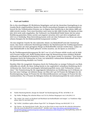 Wissenschaftliche Dienste Sachstand Seite 15 WD 8 - 3000 - 007/17 5. Fazit und Ausblick Die in den einschlägigen EU-Richtlinien festgelegten und mit der deutschen Gesetzgebung in na- tionales Recht umgewandelten Quoten des Anteils erneuerbarer Energien am Gesamtenergiever- brauch für den Verkehrssektor konnten nur zu Beginn ihrer Einführung in den Jahren 2008 und 2009 erreicht werden. Trotz einer Korrektur nach unten im Jahr 2009 wurden die Quoten ab dem Jahr 2010 nicht mehr eingehalten. Der Verbrauch von Biokraftstoff bleibt hinter den bei seiner Einführung gesteckten Zielen zurück und stagniert zwischen 2012 und 2014 weitgehend; seit 2015 ist er rückläufig. Diese Entwicklung konnte nicht mit dem Verbrauch von Strom aus erneu- 30 erbaren Energien für die Elektromobilität kompensiert werden. Als eine mögliche Ursache für den sinkenden Absatz von Biokraftstoff wird der Umstand ge- nannt, dass durch verbesserte Herstellungsverfahren das Reduktionsziel für Treibhausgasemissio- nen inzwischen mit einer geringeren Menge an Biokraftstoffen erreicht werden kann, sodass we- 31 niger Biokraftstoffe in den Markt gebracht werden mussten, um die Quote zu erreichen. Da die Treibhausgasminderungsquote für 2017 von 3,5 auf 4 Prozent erhöht wurde und ab 2020 auf 6 Prozent steigen soll, dürfte künftig jedoch sogar die Beimischung eines erhöhten Biokraft- 32 stoffanteils zum Kraftstoff erforderlich werden, um die Quote wieder zu erreichen. Eine bessere Akzeptanz durch die Verbraucher in Form von tatsächlich verbrauchtem Biokraftstoff wäre für die Quotenerreichung ebenfalls von Vorteil. Daneben führt die mangelnde Akzeptanz durch die Verbraucher zu weniger Verbrauch von Biok- raftstoffen als erhofft, die ihren Anfang bereits in der unglücklich verlaufenen Einführung des E 10-Benzins hat. Durch eine misslungene Informationspolitik waren viele Verbraucher verunsi- 33 chert. Die Verantwortung für die ungenügende Information zur Einführung von E 10-Benzin se- hen laut einer Umfrage von Infratest dimap von März 2011 gut 50 Prozent der Befragten bei der Bundesregierung, knapp 30 Prozent bei den Mineralölkonzernen und knapp 10 Prozent bei den 34 Autoherstellern. Nur 2 Prozent der Befragten hielten die Informationspolitik für nicht schlecht. 30 Fünfter Monitoring-Bericht „Energie der Zukunft“ der Bundesregierung, BT-Drs. 18/10708, S. 18 31 Vgl. Mulke, Wolfgang: Die schlechte Bilanz von E 10. In: Berliner Morgenpost vom 11.04.2016, S. 6 32 Vgl. Artikel „Der Anteil von Biodiesel und Bioethanol am Kraftstoffmarkt wird steigen“, in: Frankfurter Allge- meine, Seite V4 vom 20.01.2017 33 Vgl. Artikel „Autofahrer zapfen seltener Super E10“. In: Stuttgarter Zeitung vom 08.02.2017, S. 12 34 Vgl. Statista : das Statistik-Portal: Grafik „Wer ist aus Ihrer Sicht in erster Linie für die schlechte Information über den neuen Kraftstoff E10 verantwortlich?“, abrufbar unter https://de.statista.com/statistik/daten/stu- die/181593/umfrage/verantwortung-fuer-schlechte-information-ueber-biosprit-e10/ [lizenzpflichtig; zuletzt ab- gerufen am 20.02.2017]
