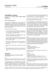 Bayerischer Landtag 16. Wahlperiode Drucksache 16/11840 26.04.2012 Schriftliche Anfrage [z. B. 2012 „Sprachgebrauch“]. Im Fach Mathematik werden zwei Domänen [z. B. 2012 „Muster und Strukturen“ sowie des Abgeordneten Thomas Mütze BÜNDNIS 90/DIE „Größen und Messen“] an einem Tag abgeprüft). GRÜNEN vom 16.02.2012 Damit erhalten die Schülerinnen bzw. Schüler drei Testhefte an drei Tagen (2012: 8., 10. und 15. Mai). VERA – Vergleichsarbeiten In der Jahrgangsstufe 8 (= Mittelschulen) besteht eine Teil An den Grund und Mittelschulen werden VERAVer nahmeverpflichtung nur für ein Fach (2012: Englisch, wobei gleichsarbeiten zur Erhebung des Leistungsstandes der in Bayern nur die Domäne „Leseverstehen“ verpflichtend Schülerinnen und Schüler geschrieben. Seit einigen Jahren war; die Domäne „Hörverstehen“ wurde auf freiwilliger werden diese meines Wissens nicht mehr als Geheft für jeden Ebene angeboten). Zudem wurden 2012 die Fächer Deutsch Schüler zur Verfügung gestellt, sondern müssen von den und Mathematik auf freiwilliger Basis angeboten. Schulen kopiert werden. Seit drei Jahren wird VERA8 in einem wechselnden Rhyth Dazu frage ich die Staatsregierung: mus verpflichtend durchgeführt: 2010 Mathematik, 2011 Deutsch, 2012 Englisch. Dieser Rhythmus – und die Ver 1. In welchen Fächern müssen die VERAVergleichsarbei pflichtung, nur an einem Fach teilzunehmen – sollen auch ten in den Grund und Mittelschulen, aufgeschlüsselt künftig beibehalten werden. Die Verpflichtung zur Teilnah nach Jahrgängen, geschrieben werden? me aller Schulen an mindestens einem Fach wird voraus sichtlich noch 2012 vonseiten der Kultusministerkonferenz 2. Welchen Umfang haben die jeweiligen Gehefte, aufge für alle Länder offiziell verabschiedet. schlüsselt nach Jahrgängen und Fächern? Zu 2.: 3. Wie viele Gehefte, aufgeschlüsselt nach Jahrgängen und Der Umfang der Testhefte schwankt von Jahr zu Jahr und ist Fächern, wurden erstellt, als sie noch zentral für ganz deshalb nur exemplarisch zu bestimmen. Zudem werden in Bayern gedruckt wurden? Bayern manchmal (siehe auch Antwort 1) nur Teile der vom Institut für Qualitätsentwicklung im Bildungswesen geliefer 4. Welche Kosten fielen für den Druck dieser Gehefte für ten Testhefte verpflichtend gestellt und demzufolge auch in ganz Bayern aufgeschlüsselt nach Jahrgängen und dieser verkürzten Fassung zum Herunterladen angeboten. Im Fächern an? Folgenden werden die Werte für 2012 benannt: 5. Welche Kosten fielen für das Verschicken der Gehefte VERA3: an? Deutsch Lesen: 12 Seiten Deutsch Sprachgebrauch: 10 Seiten 6. Hält die Staatsregierung die Erstellung der Gehefte in ei Mathematik: 16 Seiten ner zentralen Druckerei nicht für günstiger und ökologi scher? Für VERA3 damit Gesamtseitenzahl pro Schülerin bzw. Schüler: 38 Seiten. Antwort VERA8: Deutsch: 28 Seiten des Staatsministeriums für Unterricht und Kultus Mathematik: 22 Seiten vom 07.03.2012 Englisch Leseverstehen (verpflichtend): 21 Seiten Englisch gesamt (freiwillig, mit AudioDatei): 35 Seiten Zu 1.: Die bundesweiten Vergleichsarbeiten werden in den Jahr Für VERA8 an Mittelschulen (jeweils Testheft I) damit Ge gangsstufen 3 („VERA3“) und 8 („VERA8“) geschrieben. samtseitenzahl pro Schülerin bzw. Schüler: 85 Seiten, davon verpflichtend 21 Seiten. In der Jahrgangsstufe 3 (= Grundschulen) erstreckt sich die Teilnahmeverpflichtung auf zwei Fächer (Deutsch und Ma Zu 3.: thematik, wobei im Fach Deutsch zwei sog. Domänen an Die Testhefte für VERA3 werden seit Jahren zentral für zwei verschiedenen Tagen getestet werden; eine dieser ganz Bayern gedruckt und an die Schulen versandt. Im Jahr Domänen ist immer „Leseverstehen“, die andere wechselt 2012 beläuft sich dies gem. aktueller Auftragsvergabe (für ______ Drucksachen, Plenarprotokolle sowie die Tagesordnungen der Vollversammlung und der Ausschüsse sind im Internet unter www.bayern.landtag.de Dokumente abrufbar. Die aktuelle Sitzungsübersicht steht unter www.bayern.landtag.de Aktuelles/Sitzungen/Tagesübersicht zur Verfügung.