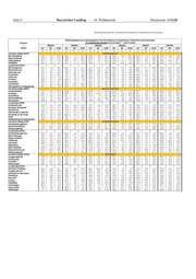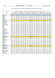 Tabelle. Schüler der Jahrgangsstufe 11 der Fachoberschule nach schulischer Vorbildung und Regierungsbezirk im Schuljahr 2008/09 a) absolut schulische Vorbildung Bayern Oberbayern Niederbayern Oberpfalz Oberfranken Mittelfranken Unterfranken Schwaben Drucksache 16/1120 Abschlusszeugnis einer 10. Klasse Hauptschule 2 788 863 255 312 203 355 304 496 mittlerer Abschluss an BS, zuletzt Hauptschule 17 5 1 1 2 4 2 2 mittlerer Abschluss an BFS, zuletzt Hauptschule 52 3 1 - 3 3 5 37 sonst. Zeugnis Fachschulreife, zuletzt Hauptschule 5 - - 1 - 1 1 2 Abschlusszeugnis einer Realschule/RSF 11 853 4 127 1 024 963 885 1 576 1 192 2 086 Abschlusszeugnis einer Wirtschaftsschule 1 404 485 116 109 113 215 138 228 Oberstufenreife (Vorrücken in Jgst. 11 Gymnasium) 3 522 1 267 289 309 231 394 337 695 erfolgreiche besondere Prüfung 237 87 15 21 20 37 19 38 qualifizierender beruflicher Bildungsabschluss 7 2 - 1 - 2 1 1 mittlerer Abschluss an BS, zuletzt sonst allg. bild. 6 2 - - - 2 1 1 mittlerer Abschluss an BFS, zuletzt sonst allg. bild. 15 2 2 1 - 2 2 6 sonst. Zeugnis Fachschulreife, zuletzt sonst.allg. Schule 47 1 46 - - - - - sonstiger mittlerer Schulabschluss 84 58 7 1 7 5 2 4 Fachhochschulreife 1 - - - - - - 1 insgesamt 20 038 6 902 1 756 1 719 1 464 2 596 2 004 3 597 b) relati v Bayerischer Landtag schulische Vorbildung Bayern Oberbayern Niederbayern Oberpfalz Oberfranken Mittelfranken Unterfranken Schwaben Abschlusszeugnis einer 10. Klasse Hauptschule 13,9% 12,5% 14,5% 18,2% 13,9% 13,7% 15,2% 13,8% · mittlerer Abschluss an BS, zuletzt Hauptschule 0,1% 0,1% 0,1% 0,1% 0,1% 0,2% 0,1% 0,1% mittlerer Abschluss an BFS, zuletzt Hauptschule 0,3% 0,0% 0,1% - 0,2% 0,1% 0,2% 1,0% sonst. Zeugnis Fachschulreife, zuletzt Hauptschule 0,0% - - 0,1% - 0,0% 0,0% 0,1% Abschlusszeugnis einer Realschule/RSF 59,2% 59,8% 58,3% 56,0% 60,5% 60,7% 59,5% 58,0% Abschlusszeugnis einer Wirtschaftsschule 7,0% 7,0% 6,6% 6,3% 7,7% 8,3% 6,9% 6,3% 16. Wahlperiode Oberstufenreife (Vorrücken in Jgst. 11 Gymnasium) 17,6% 18,4% 16,5% 18,0% 15,8% 15,2% 16,8% 19,3% erfolgreiche besondere Prüfung 1,2% 1,3% 0,9% 1,2% 1,4% 1,4% 0,9% 1,1% qualifizierender beruflicher Bildungsabschluss 0,0% 0,0% - 0,1% - 0,1% 0,0% 0,0% mittlerer Abschluss an BS, zuletzt sonst allg. bild. 0,0% 0,0% - - - 0,1% 0,0% 0,0% mittlerer Abschluss an BFS, zuletzt sonst allg. bild. 0,1% 0,0% 0,1% 0,1% - 0,1% 0,1% 0,2% sonst. Zeugnis Fachschulreife, zuletzt sonst.allg. Schule 0,2% 0,0% 2,6% - - - - - sonstiger mittlerer Schulabschluss 0,4% 0,8% 0,4% 0,1% 0,5% 0,2% 0,1% 0,1% Fachhochschulreife 0,0% - - - - - - 0,0% insgesamt 100,0% 100,0% 100,0% 100,0% 100,0% 100,0% 100,0% 100,0% Seite 9