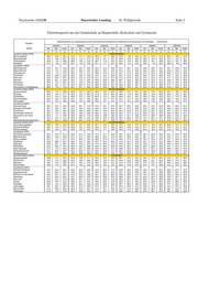 Seite 4 Bayerischer Landtag · 16. Wahlperiode Drucksache 16/1120 Übertrittsquoten aus der Grundschule an Hauptschule, Realschule und Gymnasien Übertrittsquoten aus Jahrgangsstufe 4 der Grundschule an Hauptschule, Realschule und Gymnasium zum Schuljahr … nach Kreisen Schulart --- 2002/03 2003/04 2004/05 2005/06 2006/07 2007/08 Gebiet HS RS GYM HS RS GYM HS RS GYM HS RS GYM HS RS GYM HS RS GYM % % % % % % % % % % % % % % % % % % Bayern insgesamt 47,9 17,3 32,6 45,1 20,1 32,7 42,8 20,8 34,6 41,3 21,5 35,2 38,9 22,7 36,5 38,7 22,3 37,0 Oberbayern 44,9 16,0 36,3 42,5 18,5 36,1 40,1 19,3 38,1 38,2 20,0 39,1 35,6 21,2 40,7 35,9 20,5 41,3 Niederbayern 53,7 18,0 26,7 47,5 24,2 26,7 45,7 23,9 29,2 45,1 24,8 29,2 41,5 26,4 31,1 41,9 26,2 31,0 Oberpfalz 51,7 19,0 27,6 48,3 21,7 28,6 46,2 21,7 30,7 45,2 22,7 31,2 42,5 23,7 32,7 42,4 23,8 32,7 Oberfranken 49,0 15,1 33,2 46,2 17,8 33,6 43,3 19,4 35,6 41,3 19,1 36,6 39,9 21,3 37,1 40,1 19,7 37,4 Mittelfranken 46,8 15,4 35,5 44,0 18,0 36,0 41,6 17,9 38,5 41,0 18,9 37,9 38,8 19,3 39,8 38,7 20,1 39,2 Unterfranken 48,3 18,5 31,3 46,2 20,6 31,7 43,0 22,1 33,6 41,4 23,2 34,0 39,7 23,9 34,8 39,0 23,8 35,2 Schwaben 47,7 20,5 30,5 46,1 22,3 29,7 44,8 23,8 29,9 43,5 24,4 30,8 41,5 26,1 31,2 39,6 25,1 33,3 kreisfreie Städte (OBB) OBERBAYERN Ingolstadt 53,3 16,5 28,2 53,5 16,4 28,1 47,3 17,3 32,9 45,8 20,2 32,6 46,9 19,6 32,4 42,8 20,1 35,8 München/Stadt 33,8 14,2 44,4 34,5 13,4 44,1 31,2 15,1 46,6 29,8 15,3 47,4 28,5 15,4 49,2 29,7 14,7 49,4 Rosenheim/Stadt 51,7 12,4 34,6 47,8 14,7 35,6 45,7 17,0 35,5 49,3 14,4 34,1 45,0 17,1 36,3 43,6 16,1 39,5 Landkreise (OBB) Altötting 53,9 17,5 27,6 54,3 19,2 25,8 51,8 19,5 27,4 48,9 19,6 30,1 46,3 23,0 29,8 44,4 21,7 33,0 Berchtesgadener Land 64,1 5,6 29,0 47,5 23,0 28,0 46,6 24,0 28,8 39,9 26,2 31,9 35,6 29,6 32,2 38,5 26,6 33,8 Bad Tölz-Wolfratshausen 49,2 16,0 33,6 44,9 20,2 33,6 45,2 19,0 34,3 44,2 19,6 35,1 38,8 24,1 35,7 41,5 22,5 34,9 Dachau 49,3 13,9 35,0 45,3 19,3 33,2 43,8 19,8 34,8 44,0 18,6 35,7 40,1 23,0 35,4 40,8 23,7 33,7 Ebersberg 39,6 16,1 43,3 37,3 20,5 41,0 35,6 19,6 43,5 32,1 22,2 44,6 30,6 22,2 46,1 32,2 20,1 46,0 Eichstätt 44,9 28,8 25,5 44,5 28,6 26,5 42,1 28,4 28,6 40,7 26,7 31,1 37,3 28,9 32,7 38,2 29,3 32,0 Erding 46,3 24,1 28,0 47,3 23,0 28,7 41,1 24,6 33,1 40,0 26,8 32,3 37,5 28,7 32,9 36,6 26,6 35,8 Freising 52,2 10,2 35,6 46,7 17,6 34,0 44,8 16,7 36,9 42,2 19,0 37,4 39,1 19,5 39,9 39,9 18,2 40,7 Fürstenfeldbruck 35,8 19,0 44,2 34,2 19,2 45,0 32,4 19,8 47,0 33,7 19,4 46,1 28,9 23,2 46,8 32,9 18,0 48,2 Garmisch-Partenkirchen 56,4 0,9 39,7 50,7 16,4 31,8 43,0 16,9 38,5 39,5 19,9 39,3 40,4 21,0 37,7 42,5 20,8 35,5 Landsberg am Lech 49,6 17,5 30,9 45,7 21,5 30,8 40,0 22,5 35,9 43,1 21,9 33,1 39,2 24,1 34,8 37,4 24,5 35,8 Miesbach 62,6 1,5 35,4 46,7 15,1 36,2 48,4 18,4 32,5 43,7 20,2 34,3 40,3 22,9 35,5 36,6 22,4 38,8 Mühldorf am Inn 52,7 17,8 27,4 49,4 23,1 26,1 50,0 23,4 25,6 47,9 21,6 28,7 46,2 22,2 30,4 44,9 24,1 29,6 München/Land 31,6 15,9 50,7 32,0 16,9 49,5 28,8 17,2 52,4 26,2 18,4 53,7 22,0 18,8 57,4 24,3 18,0 56,5 Neuburg-Schrobenhausen 49,7 25,6 23,5 47,1 22,6 29,0 48,0 22,3 29,0 47,5 24,5 27,4 41,5 27,0 30,0 42,9 26,4 30,2 Pfaffenhofen an den Ilm 53,9 20,4 24,2 51,5 21,3 25,3 48,1 20,4 30,6 46,1 19,7 32,9 42,1 24,0 32,8 46,3 22,3 30,3 Rosenheim/Land 53,6 14,2 30,5 47,1 18,6 33,2 45,5 22,9 30,7 44,1 22,3 32,3 41,5 22,7 34,7 41,7 21,6 35,6 Starnberg 35,0 12,7 50,7 35,3 15,8 48,1 33,6 14,8 49,6 28,8 15,7 53,6 28,3 14,9 54,9 26,2 16,2 55,6 Traunstein 52,0 19,9 27,0 52,0 20,4 26,2 49,6 20,4 28,6 47,0 25,7 26,4 46,1 24,7 28,3 42,5 24,6 31,6 Weilheim-Schongau 45,7 22,4 30,7 41,0 22,8 33,3 44,7 24,0 30,2 39,9 23,8 35,2 38,2 24,0 36,3 35,3 26,4 37,3 kreisfreie Städte (NDB) NIEDERBAYERN Landshut/Stadt 49,5 14,3 32,8 41,1 20,5 36,7 40,6 14,6 43,9 37,9 17,6 42,4 32,2 20,1 46,6 31,4 21,1 46,2 Passau/Stadt 46,9 15,3 35,7 44,9 12,2 40,3 40,8 10,4 46,8 40,0 8,5 50,1 38,3 13,5 47,2 38,6 18,0 42,7 Straubing 50,0 11,9 34,0 48,5 12,9 35,9 47,5 11,3 37,3 44,4 17,3 35,9 46,2 10,7 41,3 46,2 14,0 38,4 Landkreise (NDB) Deggendorf 53,2 21,5 23,6 51,3 21,6 25,1 49,2 20,1 29,6 51,9 20,7 26,2 43,2 26,5 28,9 44,2 25,4 30,1 Freyung-Grafenau 52,4 24,3 21,9 50,5 26,3 22,4 46,6 24,3 28,1 48,9 22,7 27,7 45,0 26,1 28,3 45,9 28,1 25,7 Kelheim 61,4 12,8 24,5 46,8 23,5 28,3 45,8 24,6 28,1 47,9 23,2 27,9 46,4 25,0 27,7 46,3 21,9 31,3 Landshut/Land 50,1 18,6 29,8 45,6 25,9 27,3 43,4 26,9 29,0 40,9 28,6 30,1 36,1 30,3 32,8 35,8 30,5 33,2 Passau/Land 50,0 23,3 25,6 45,4 25,2 27,9 45,9 24,9 27,9 44,6 25,3 29,4 42,0 27,2 29,7 41,2 28,0 29,8 Regen 49,0 28,2 19,9 44,0 30,6 23,4 45,1 30,2 23,5 43,6 35,2 20,0 39,0 34,1 26,1 40,8 30,9 28,1 Rottal-Inn 63,5 6,3 28,8 53,8 23,4 21,0 49,5 25,7 23,5 48,6 26,2 24,2 44,2 27,4 27,7 47,8 24,9 26,0 Straubing-Bogen 48,1 24,8 25,9 48,0 23,8 27,1 43,1 25,4 30,6 41,3 25,7 32,4 40,4 25,4 33,7 40,9 27,8 30,4 Dingolfing-Landau 62,5 7,0 29,7 46,2 28,5 24,1 46,3 25,1 27,8 44,0 26,6 28,5 43,3 28,1 27,8 41,7 26,4 30,6 kreisfreie Städte (OPF) OBERPFALZ Amberg/Stadt 56,4 10,4 28,8 59,4 9,4 27,6 54,6 8,0 35,0 55,0 12,5 30,7 48,4 13,9 36,1 52,0 14,1 30,9 Regensburg/Stadt 44,7 14,8 39,1 45,2 13,6 39,7 40,3 17,6 40,2 38,9 17,1 42,6 36,2 15,8 46,2 38,9 15,2 44,1 Weiden in der Oberpfalz 48,8 14,4 33,3 50,7 12,6 34,7 44,0 14,8 37,7 51,4 12,3 34,0 45,2 12,6 41,5 43,1 14,2 39,9 Landkreise (OPF) Amberg-Sulzbach 51,9 19,2 26,6 52,0 19,1 27,6 50,3 18,8 29,7 50,2 18,3 30,5 45,7 21,6 31,5 46,3 21,1 31,5 Cham 50,9 27,5 20,6 47,3 28,5 23,3 45,5 27,8 26,1 45,8 27,8 25,6 41,9 30,7 26,4 40,4 30,4 28,5 Neumarkt in der Oberpfalz 52,1 22,6 24,6 49,8 21,0 28,2 49,0 22,7 27,1 48,0 22,2 29,2 45,0 25,1 28,9 41,4 26,7 31,2 Neustadt an der Waldnaab 57,6 12,3 27,7 51,7 21,8 25,7 52,8 21,4 24,3 47,7 19,9 31,7 47,0 21,6 30,2 49,7 20,3 28,7 Regensburg/Land 44,9 21,6 31,9 41,2 22,9 34,6 39,9 20,9 37,9 36,2 26,5 36,3 36,2 25,8 37,3 35,3 26,1 37,7 Schwandorf 60,5 12,7 25,2 50,3 25,2 22,5 46,0 26,2 26,5 45,9 26,4 26,6 45,6 24,7 28,8 4